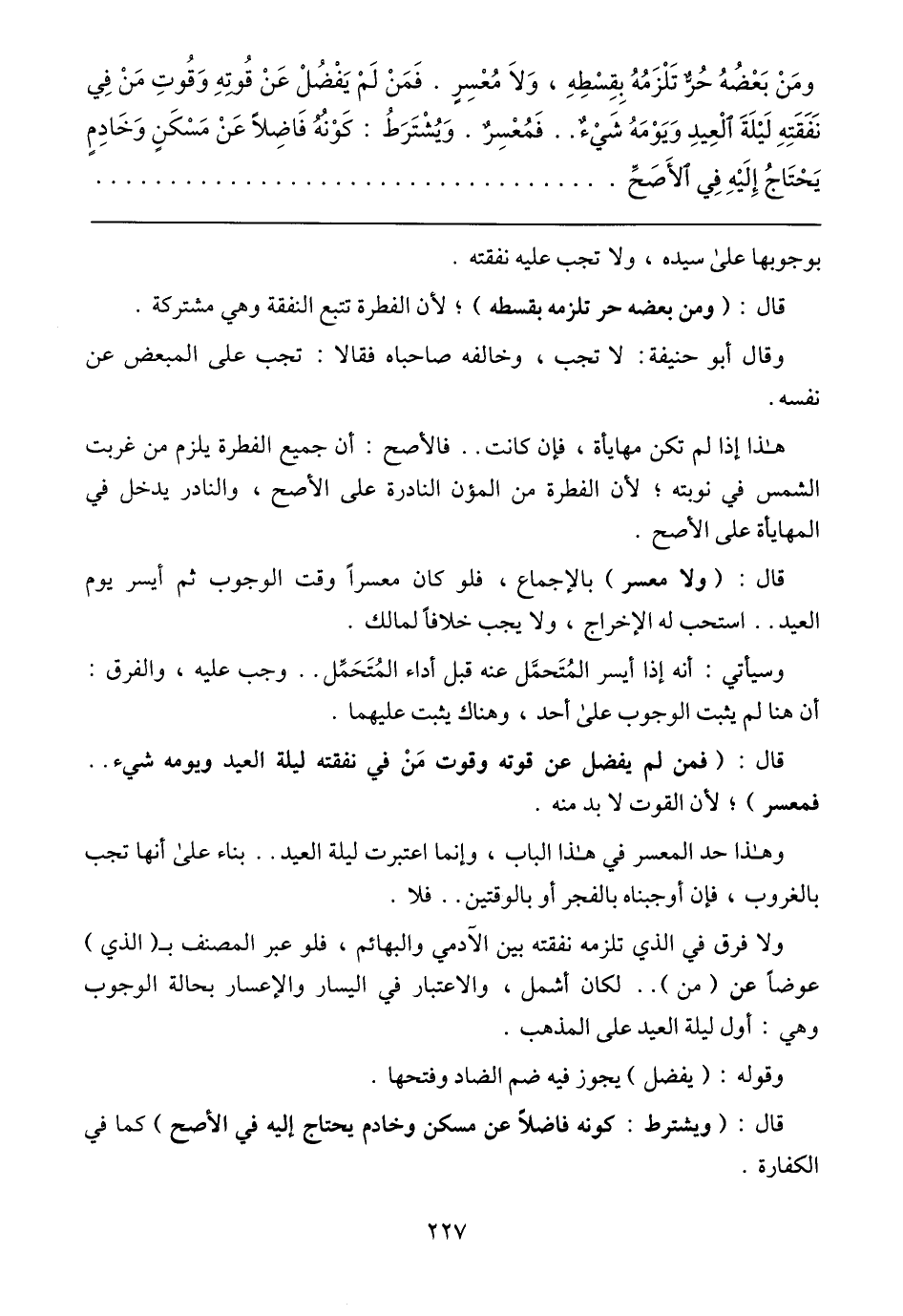 ومَنْ بَعْضُهُ حُرٌّ تَلْزَمُهُ بِقِسْطِهِ، وَلا َمُعْسِرٍ. فَمَنْ لَمْ يَفضُلْ عَنْ قُوتِهِ وَقُوتِ مَنْ فِي نَفَقَتِهِ لَيْلَةَ اٌلْعِيدِ وَيَوْمَهُ شَيءٌ .. فَمُعْسِرٌ. وَيُشْتَرَطُ: كَوْنُهُ فَاضِلًا عَنْ مَسْكَنٍ وَخَادِمٍ يَحْتَاجُ إِلَيْهِ فِي الأَصَحِّ
