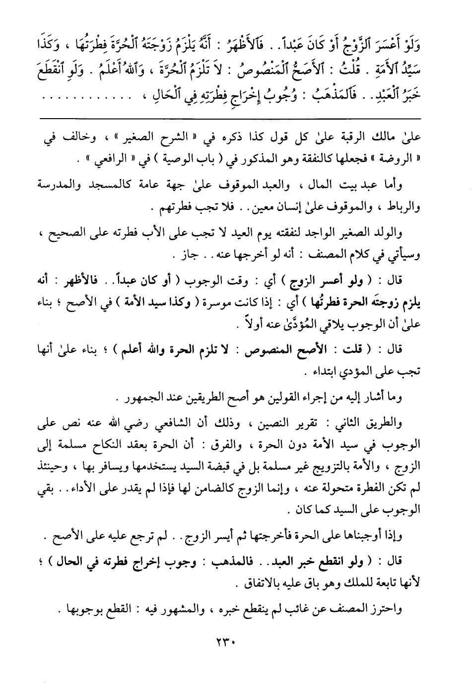 والطريق الثاني: تقرير النصين، وذلك أن الشافعي رضي الله عنه نص على الوجوب في سيد الأمة دون الحرة، والفرق: أن الحرة بعقد النكاح مسلمة إلى الزوج، والأمة بالتزويج غير مسلمة بل في قبضة السيد يستخدمها ويسافر بها، وحينئذ لم تكن الفطرة متحولة عنه، وإنما الزوج كالضامن لها فإذا لم يقدر على الأداء .. بقى الوجوب على السيد كما كان.