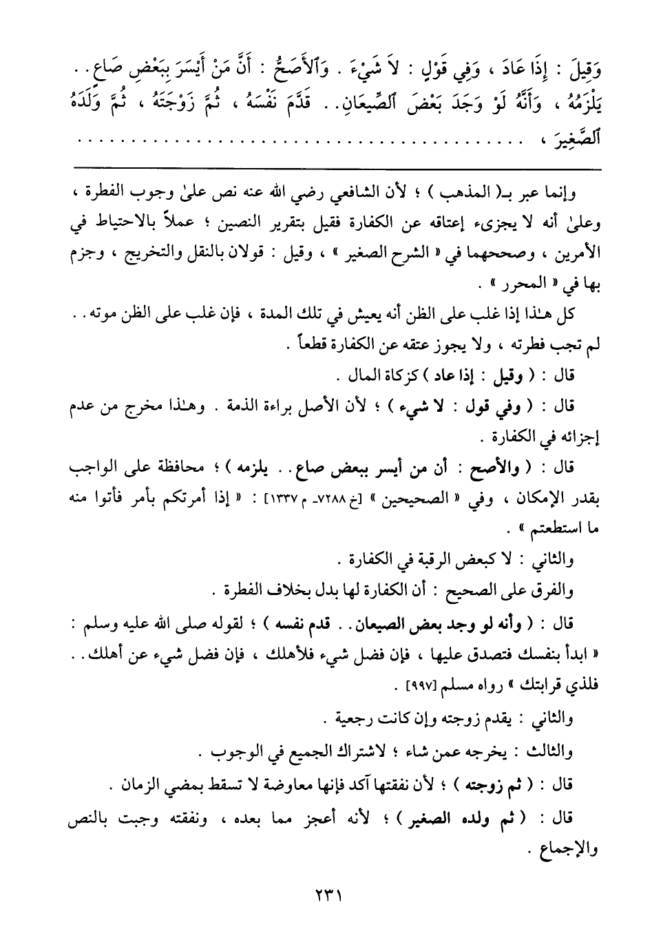 وَقِيلَ: إِذَا عَادَ، وَفِي قَوْل: لَا شَيءَ. وَاٌلأَصَحُ: أن مَنْ أَيْسَرَ بِبَعْضِ صَاعِ .. يَلْزَمُهُ، وَأَنَهُ لَوْ وَجَدَ