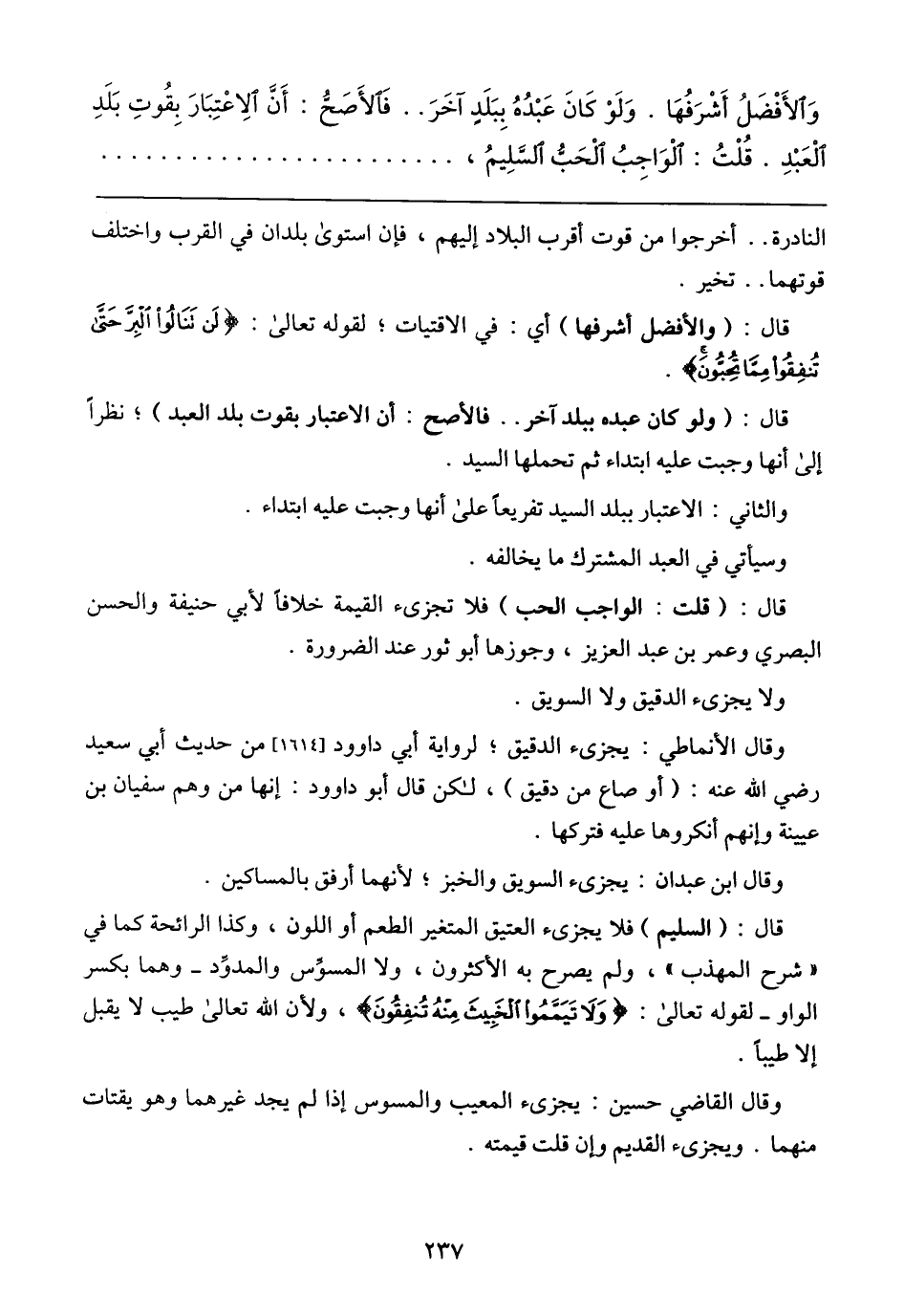 قال: (والأفضل أشرفها) أي: في الاقتيات؛ لقوله تعالي: {لَنْ تَنَالُوا الْبِرَّ حَتَّى تُنْفِقُوا مِمَّا تُحِبُّونَ}.