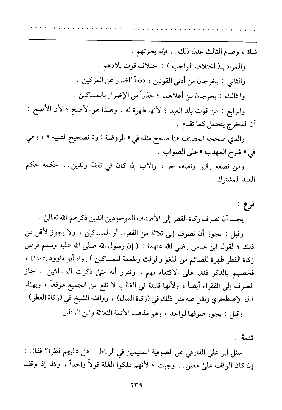 وقيل: يجوز أن تصرف إلى ثلاثة من الفقراء أو المساكين، ولا يجوز لأقل من ذلك؛ لقول ابن عباس رضي الله عنهما: (إن رسول الله صلى الله عليه وسلم فرض زكاة الفطر طهرة للصائم من اللغو والرفث وطعمة المساكين) رواه أبو داوود [1605]، فخصم بالذكر فدل على الاكتفاء بهم، وتقرر أنها متى ذكرت المساكين .. جاز الصرف إلي الفقراء أيضا، ولأنها قليلة في الغالب لا تقع من الجميع موقعًا، وبهذا قال الإصطخري ونقل عنه مثل ذلك في (زكاة المال)، ووافقه الشيخ في (زكاة الفطر).
