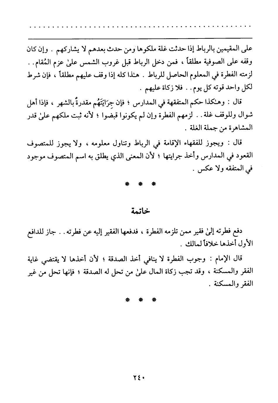 على المقيمين بالرباط إذا حدثت غلة ملكوها ومن حدث بعدهم لا يشاركهم. وإن كان وقفة على الصوفية مطلقًا، فمن دخل الرباط قبل غروب الشمس على عزم المقام. لزمته الفطرة في المعلوم الحاصل للرباط. هذا كله إذا وقف عليهم مطلقًا، فإن شرط لكل واحد قوته كل يوم ... فلا زكاة عليهم.
