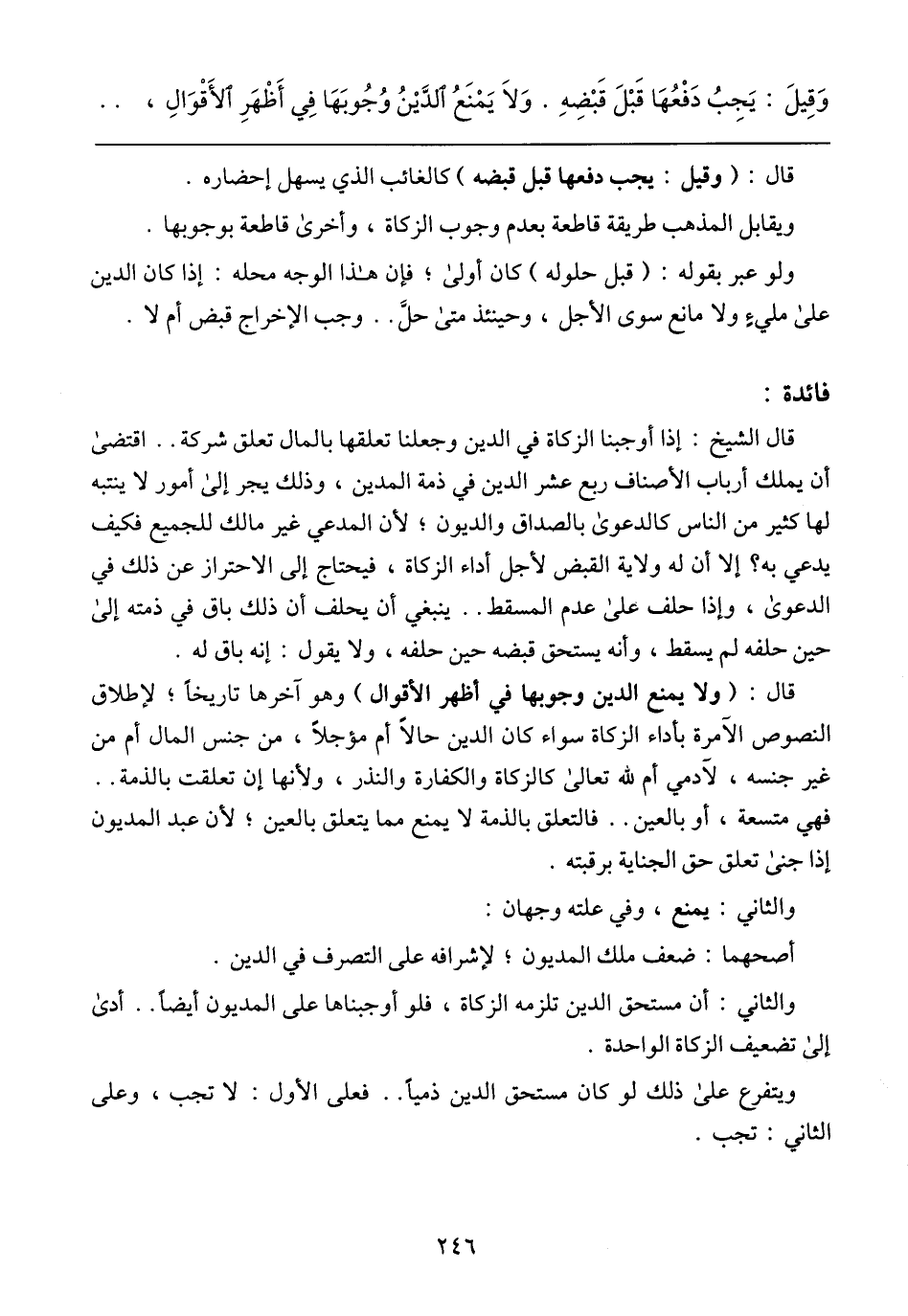قال: (ولا يمنع الدين وجوبها في أظهر الأقوال) وهو آخرها تاريخًا؛ لإطلاق النصوص الآمرة بأداء الزكاة سواء كان الدين حالًا أم مؤجلًا, من جنس المال أم غير جنسه, لآدمي أم لله تعالى كالزكاة والكفارة والنذر, ولأنها إن تعلقت بالذمة .. فهي متسعة, أو بالعين .. فالتعلق بالذمة لا يمنع مما تعلق بالعين؛ لأن عبد المديون إذا جني تعلق حق الجناية برقبته.