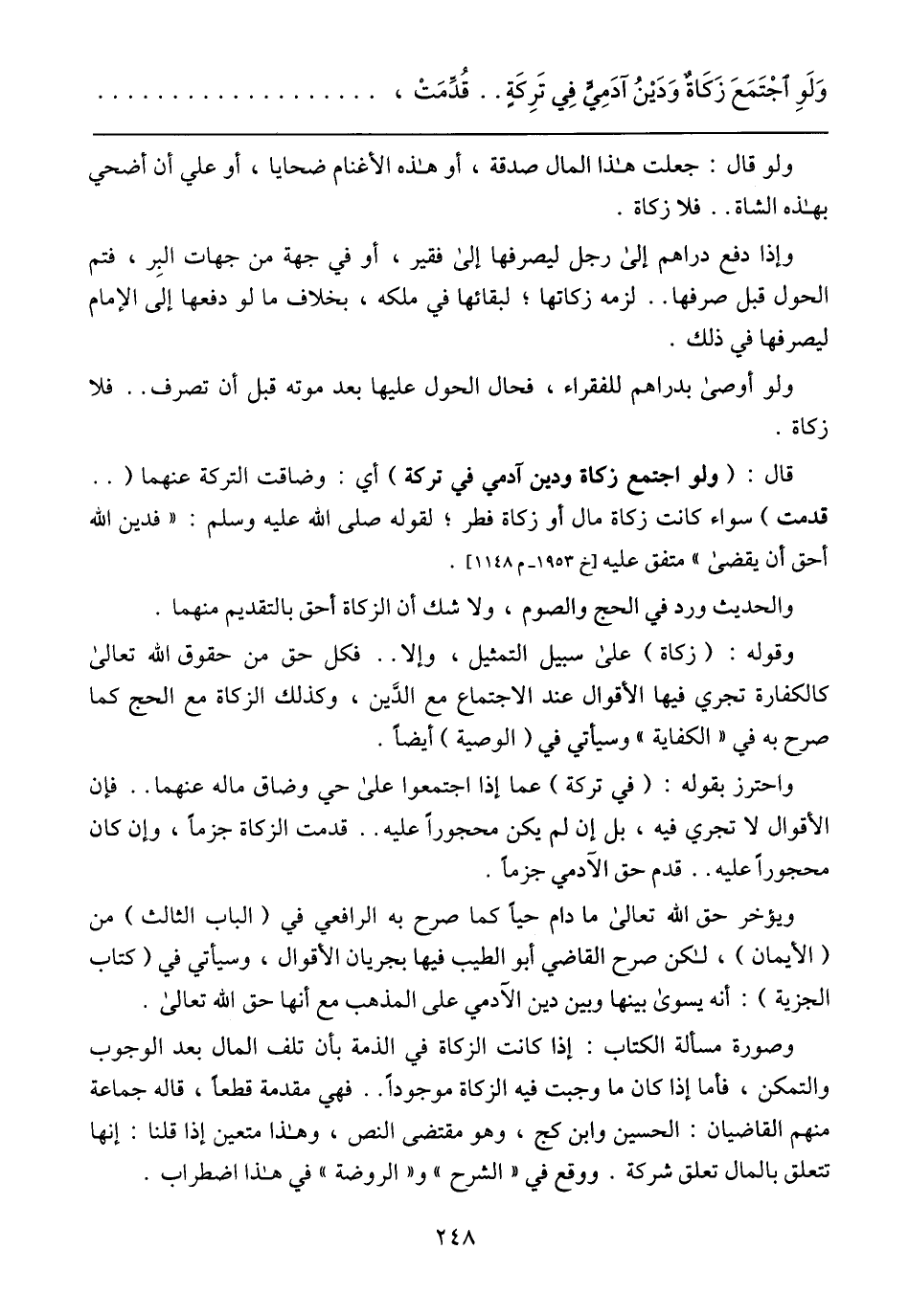 وقوله: (زكاة) على سبيل التمثيل, وإلا .. فكل حق من حقوق الله تعالى كالكفارة تجرى فيها الأقوال عند الاجتماع مع الدين, وكذلك الزكاة مع الحج كما صرح به في (الكفاية) وسيأتي في (الوصية) أيضا.