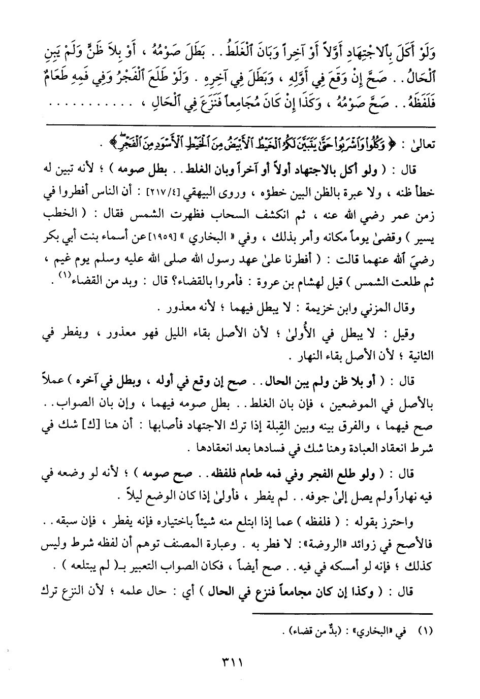 وَلُو أُكَلّ بالأجتهاد أَوَّلا أَو آخِرًا وَبانَ الغَلَط .... بَطُلَ صَوْمهُ، أَو بَلًّا ظَنّ وَلَم يُبَن الحال .... صَحَّ إِن وَقَعَ ِفي أُولَه، وَبَطَلَ ِفي آخِرهُ. وَلُو طَلَعَ الفَجْر وَفِيَّ فَمهُ طعا فَلَفْظهُ ... صَحَّ صَوْمهُ، وَكَذا إِن كانَ مجامعا فَنَزْع في الحال،