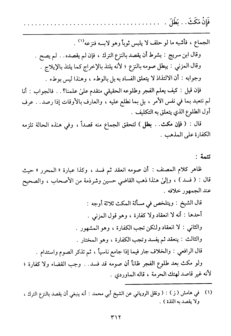 قال: (فإن مكث ..... بطل) لتحقق الجماع منه قصدًا، وفي هذه الحالة تلزمه الكفارة على المذهب.