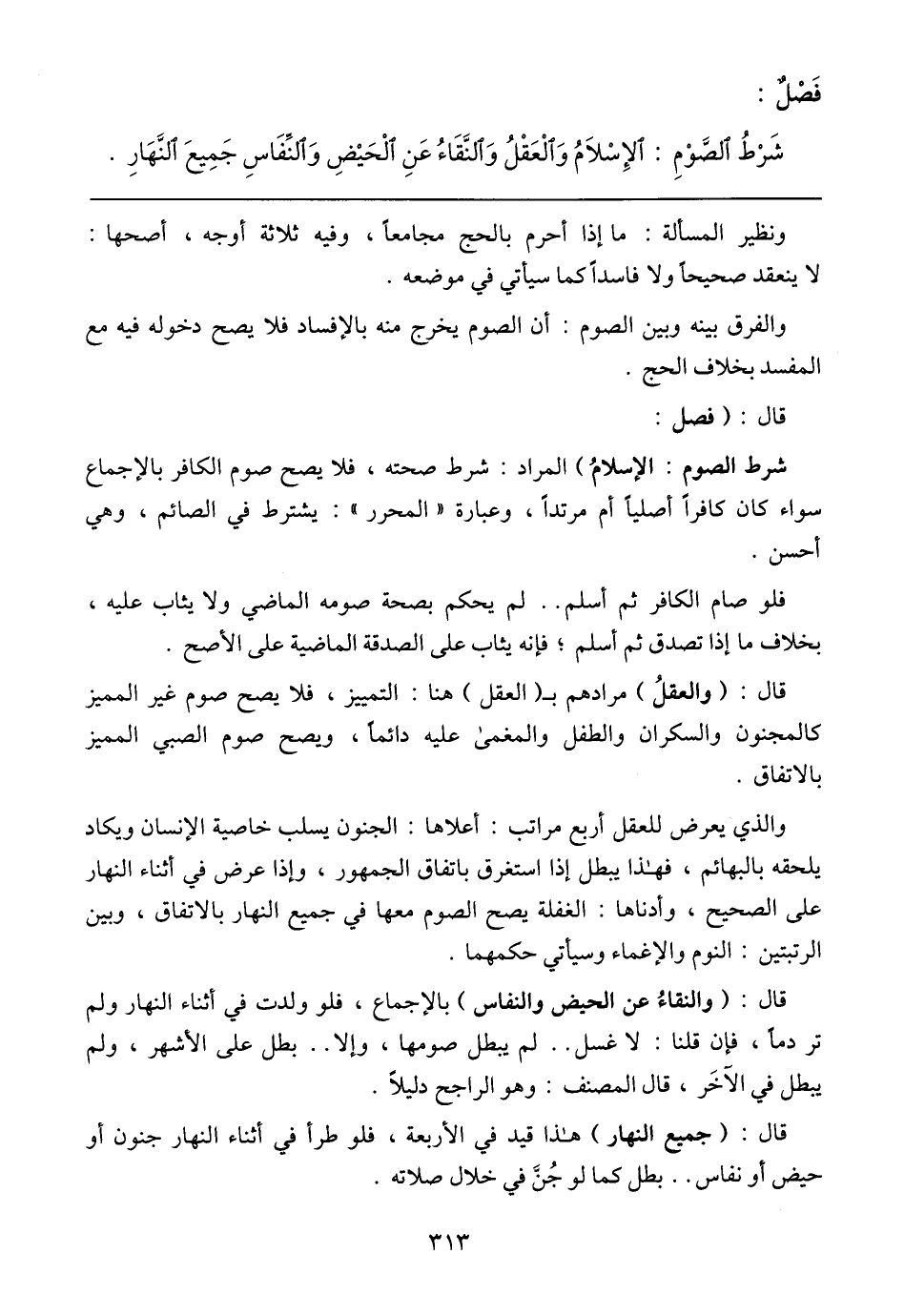 قال: (فصل: شرط الصوم: الإسلام) المراد: شرط صحته، فلا يصح صوم الكافر بالإجماع سواء كان كافرًا أصليا أم مرتدًا، وعبارة (المحرر): يشترط في الصائم، وهي أحسن.