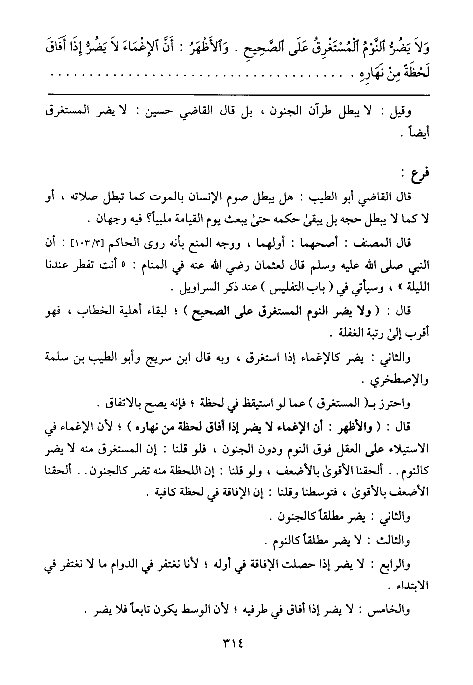 وَلا يُضَرّ النَوْم المُسْتَغْرِق عَلَى الصَحِيح. وَالأَظْهُر: أَن الإِغْماء لا يُضَرّ إِذا أَفّاق لَحْظَة مَن نَهارهُ