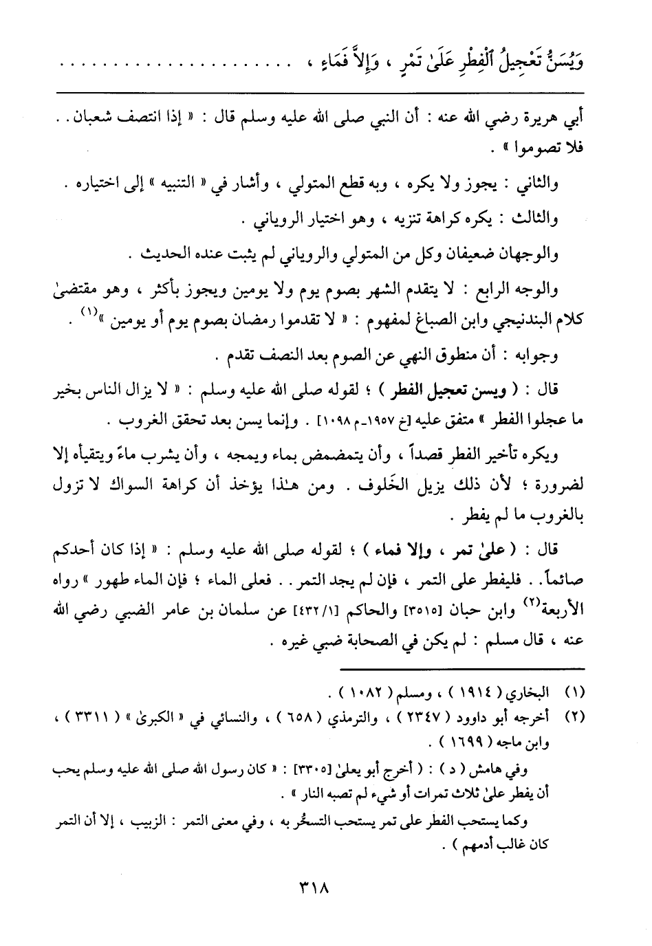 قال: (على تمر، وإلا فماء)؛ لقوله صلى الله عليه ةسلم: (إذا كان ~أحدكم صائما ... فليفطر على التمر، فإن لم يجد التمر .... فعلى الماء؛ فإن الماء طهور) رواه الأربعة وابن حبان (3515) والحاكم (1/ 432) عن سلمان بن عامر الضبي رضي الله عنه، قال مسلم: لم يكن في الصحابة ضبي غيره.