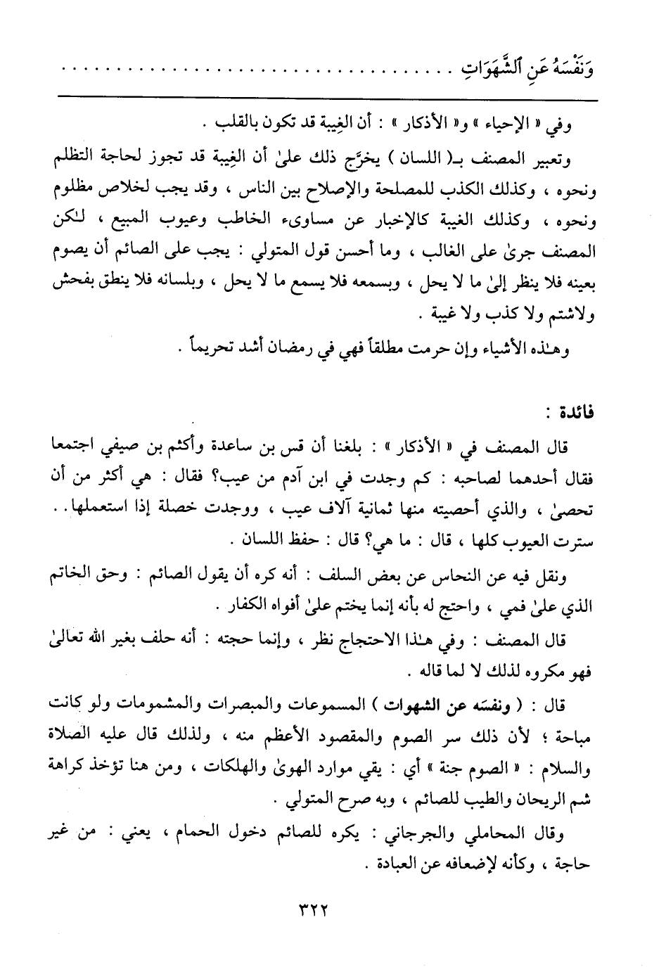 وتعبير المصنف ب (اللسان) يخرج ذلك على أن الغيبة قد تجوز لحاجة التظلم ونجوه، وكذلك الغيبة كا لإخبار عن مساوئ الخاطب وعيوب المبيع، لكن المصنف جرى على الغالب، وما أحسن قول المتولي: يجب على الصائم أن يصوم بعينه فلا ينظر إلى ما لا يحل، وبسمعه فلا يسمع ما لا يحل، وبلسانه فلا ينطق بفحش ولا شتم ولا كذب ولا غيبة.