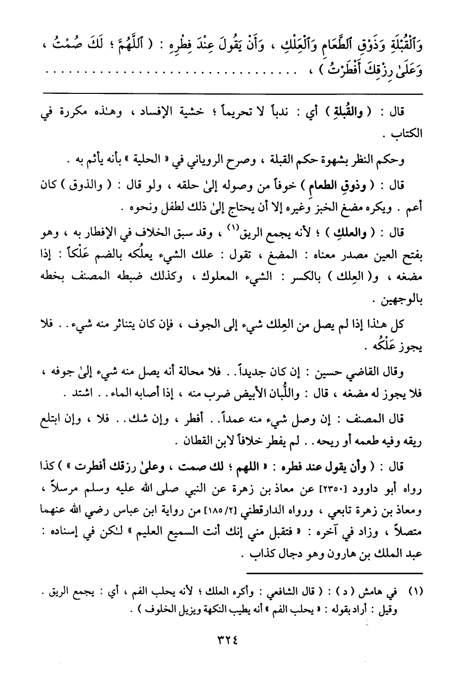 وَالقِبْلَة وَذَوْق الطَعام وَالعِلْك، وَإِن يَقُول عَنِدَ فِطَرهُ: (اللَهْم؛ لَكّ صَمَتتَ، وَعَلَى رِزْقكَ أَفْطَرتِ)،