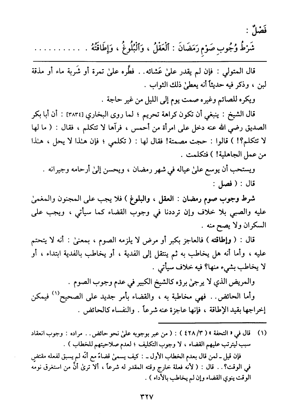 شَرْطُ وُجُوبِ صَوْمِ رَمَضَانَ: الْعَقْلُ، وَالْبُلُوغُ، وَإِطَاقَتْهُ
