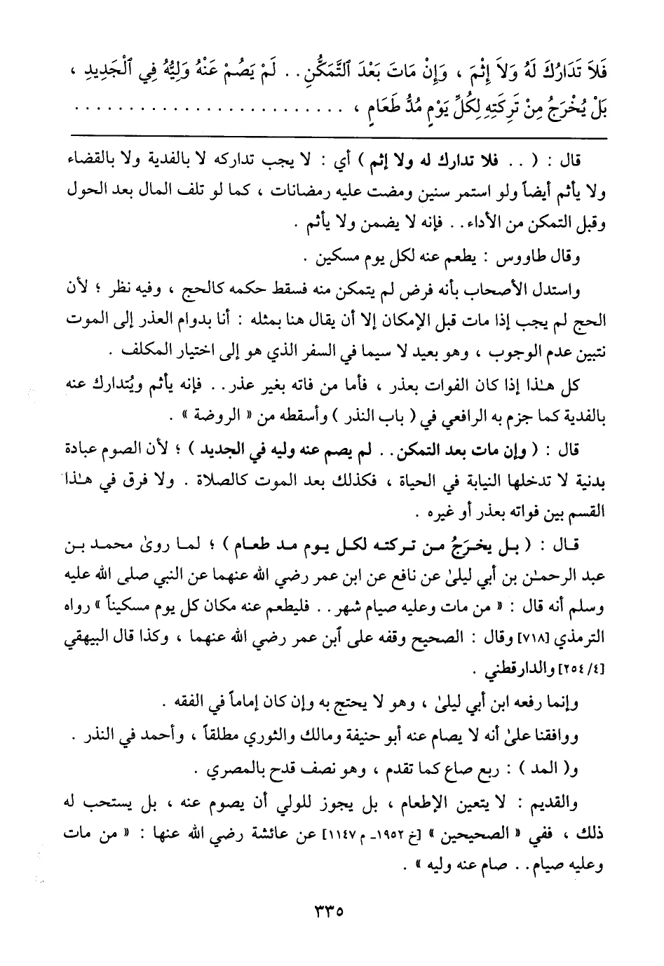 قال: (بل يخرَجُ من تركته لكل يوم مد طعام)؛ لما روى محمد بن عبد الرحمن بن أبي ليلى عن نافع عن ابن عمر رضي الله عنهما عن النبي صلى الله عليه وسلم أنه قال: (من مات وعليه صيام شهر .. فليطعم عنه مكان كل يوم مسكينًا) رواه الترمذي [718] وقال: الصحيح وقفه على ابن عمر رضي الله عنهما، وكذا قال البيهقي [4/ 254] والدارقطني.