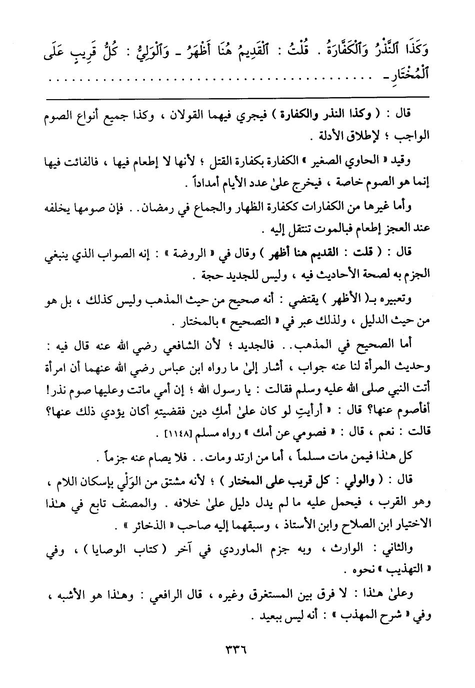 وَكَذَا النَّذْرُ وَالْكَفَّارَةُ. قُلْتُ: الْقَدِيمُ هُنَا أَظْهَرُ –وَالْوَلِيُّ: كُلُّ قَرِيبٍ عَلَى الْمُخْتَارِ-
