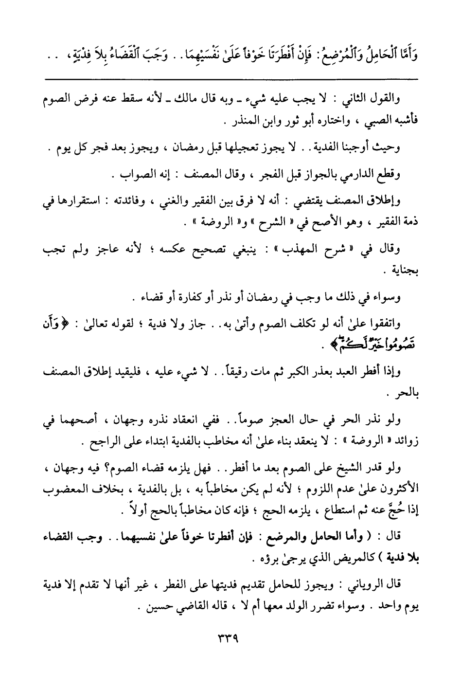 ولو نذر الحر في حال العجز صومًا .. ففي انعقاد نذره وجهان، أصحهما في زوائد (الروضة): لا ينعقد بناء على أنه مخاطب بالفدية ابتداء على الراجح.