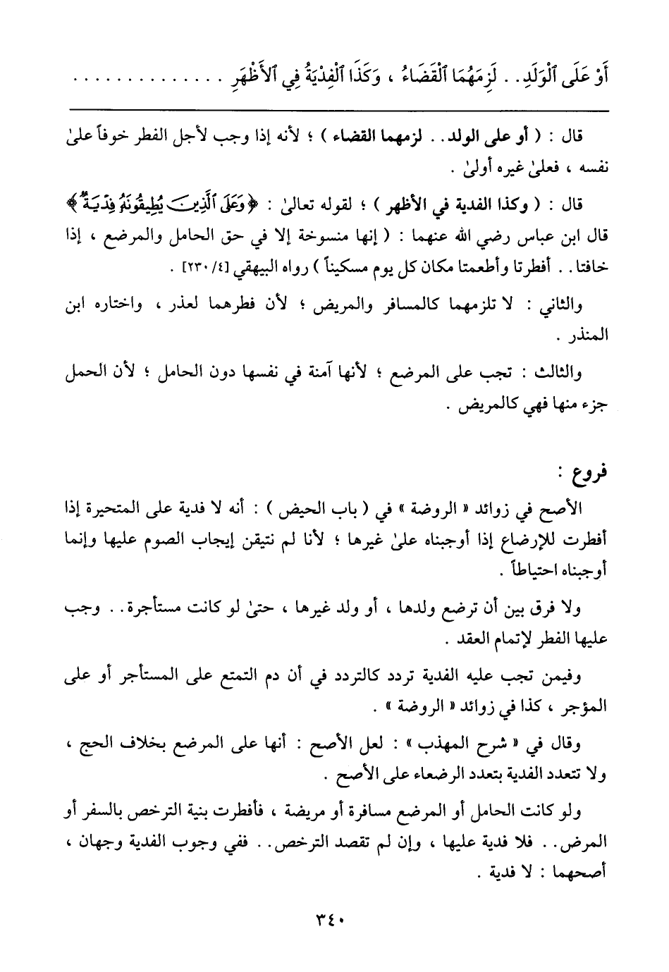 قال: (وكذا الفدية في الأظهر)؛ لقوله تعالى: {وَعَلَى الَّذِينَ يُطِيقُونَهُ فِدْيَةٌ} قال ابن عباس رضي الله عنهما: (إنها منسوخة إلا في حق الحامل والمرضع، إذا خافتا .. أفطرتا وأطعمتا مكان كل يوم مسكينًا) رواه البيهقي [4/ 230].