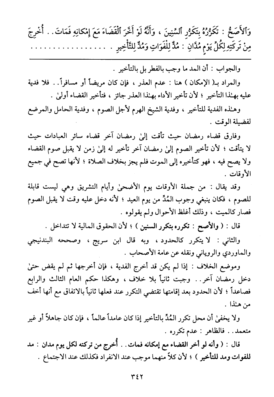 وَالأَصَحُّ: تَكَرُّرُهُ بِتَكَرُّرِ السِّنِينَ، وَأَنَّهُ لَوْ أَخَّرَ الْقَضَاءَ مَعَ إِمْكانِهِ فَمَاتَ .. أُخْرِجَ مِنْ تَركَتِهِ لِكُلِّ يَوْمٍ مُدَّانِ: مُدٌّ لِلْفَوَاتِ وَمُدٌّ لِلتَّاخِيرِ