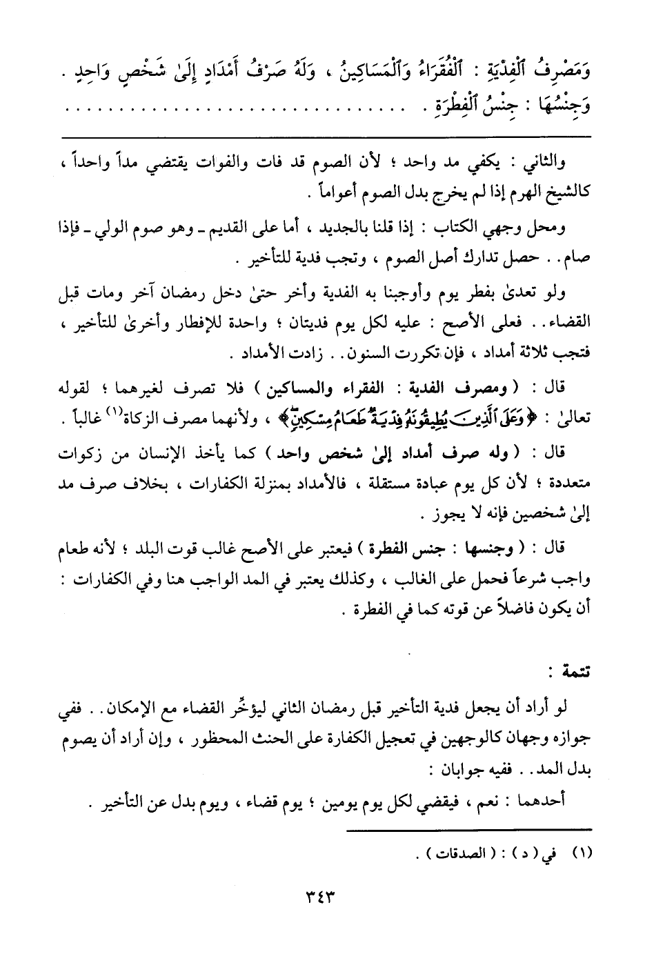 وَمَصْرَفُ الْفِدْيَةِ: الْفُقَرَاءُ وَالْمَسَاكِينُ، وَلَهُ صَرْفُ أَمْدَادٍ إِلَى شَخْصٍ وَاحِدٍ. وَجِنْسُهَا: جِنْسُ الْفِطْرَةِ