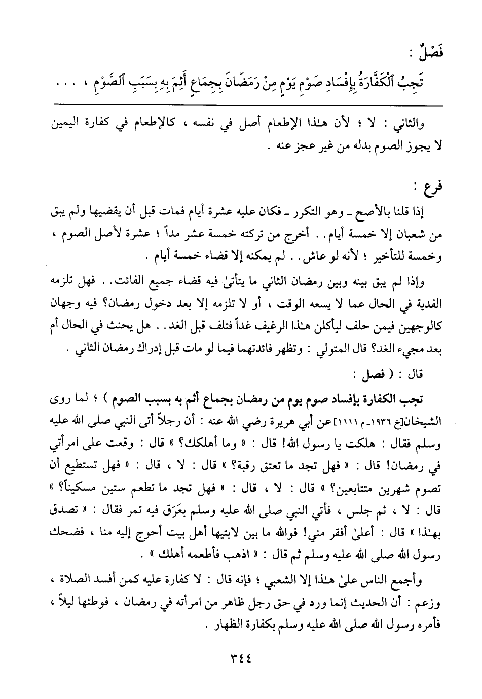 تجب الكفارة بإفساد صوم يوم من رمضان بجماع أثم به بسبب الصوم)؛ لما روى الشيخان [خ 1936 - م 1111] عن أبي هريرة رضي الله عنه: أن رجلًا أتى النبي صلى الله عليه وسلم فقال: هلكت يا رسول الله! قال: (وما أهلكك؟) قال: وقعت على امرأتي في رمضان! قال: (فهل تجد ما تعتق رقبة؟) قال: لا، قال: (فهل تستطيع أن تصوم شهرين متتابعين؟) قال: لا، قال: (فهل تجد ما تطعم ستين مسكينًا؟) قال: لا، ثم جلس، فأتي النبي صلى الله عليه وسلم بعَرَق فيه تمر فقال: (تصدق بهذا) قال: أعلى أفقر مني! فوالله ما بين لابتيها أهل بيت أحوج إليه منا، فضحك رسول الله صلى الله عليه وسلم ثم قال: (اذهب فأطعمه أهلك).