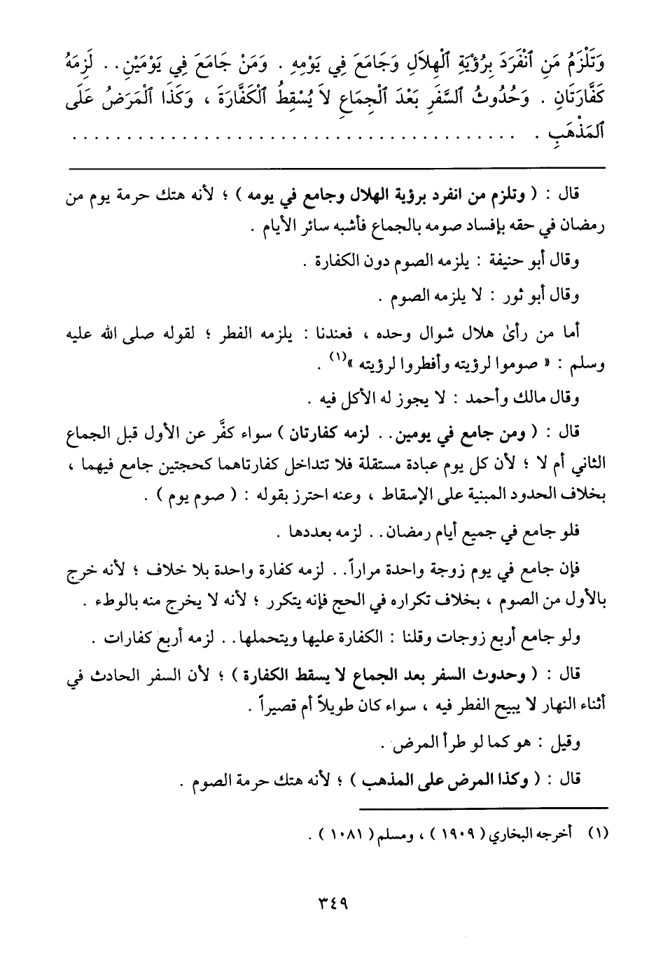 وَتَلْزَمُ مَنِ انْفَرَدَ بِرُؤْيَةِ الْهِلَالِ وَجَامَعَ فِي يَوْمِهِ. وَمَنْ جَامَعَ فِي يَوْمَيْنِ .. لَزِمَهُ كَفَّارَتَانِ. وَحُدُوثُ السَّفَرِ بَعْدَ الْجِمَاعِ لَا يُسْقِطُ الْكَفَّارَةَ، وَكَذَا الْمَرَضُ عَلَى المَذْهَبِ
