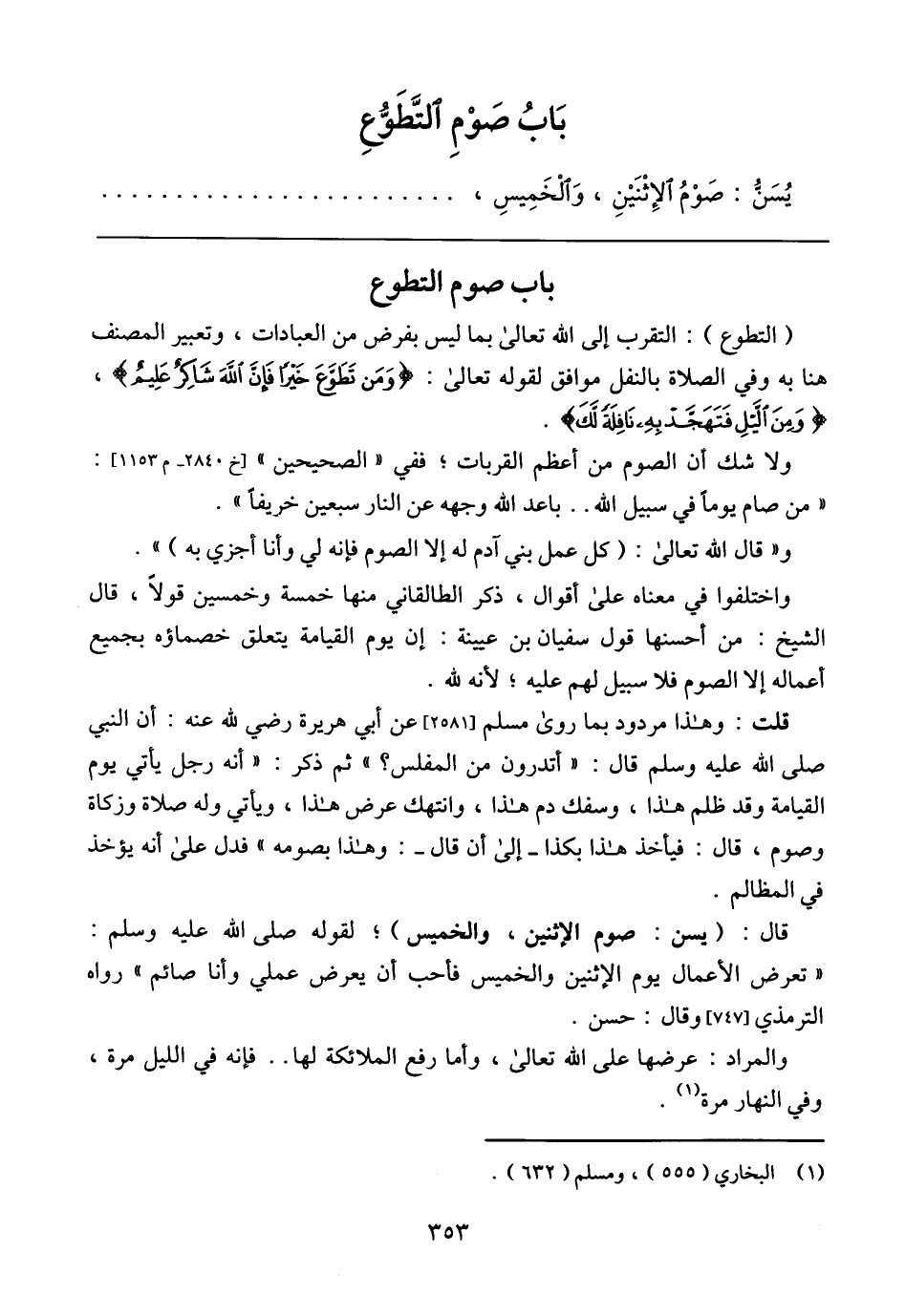 (التطوع): التقرب إلى الله تعالى بما ليس بفرض من العبادات، وتعبير المصنف هنا به وفي الصلاة بالنفل موافق لقوله تعالى?: {وَمَن تَطَوَّعَ خَيْرًا فَإِنَّ اللهِ شَاكِرٌ عَلِيمٌ}، {وَمِنَ الَّيْلِ فَتَهَجَّدْ بِهِ نَافِلَةً لَّكَ}.
