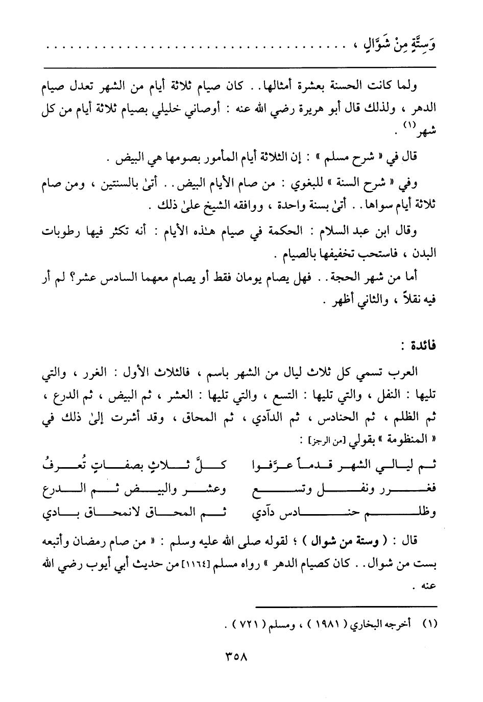 وفي (شرح السنة) للبغوي: من صام الأيام البيض .. أتى بالسنتين، ومن صام ثلاثة أيام سواها .. أتى بسنة واحدة، وافقه الشيخ على ذلك.