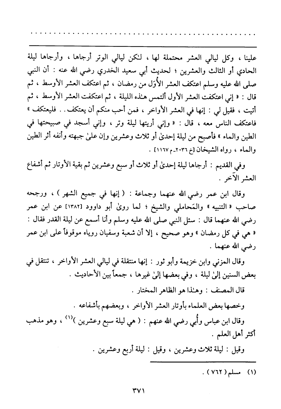 وقال ابن عمر رضي الله عنهما وجماعة: (إنها في جميع الشهر)، ورجحه صاحب (التنبيه) والمَحاملي والشيخ؛ لما روى? أبو داوود عن ابن عمر رضي الله عنهما قال: سئل النبي صلى الله عليه وسلم وأنا أسمع عن ليلة القدر فقال: (هي في كل رمضان) وهو صحيح، إلا أن شعبة وسفيان روياه موقوفًا على ابن عمر رضي الله عنهما.