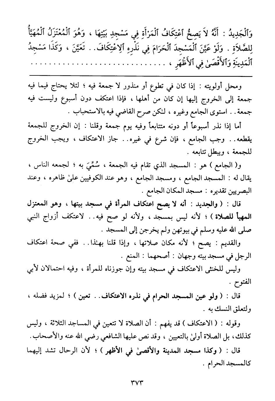 وَالْجَدِيدُ: أَنَّهُ لاَ يَصِحُّ اعْتِكَافُ الْمَرْأَةِ فِي مَسْجِدِ بَيْتِهَا، وَهُوَ الْمُعْتَزَلُ الْمُهَيَّأُ لِلصَّلاَةِ. وَلَوْ عَيَّنَ الْمَسْجِدَ الْحَرَامَ فِي نَذْرِهِ الاِعْتِكَافَ .. تَعَيَّنَ، وَكَذَا مَسْجِدُ الْمَدِينَةِ وَالأَقْصَى? فِي الأَظْهَرِ،