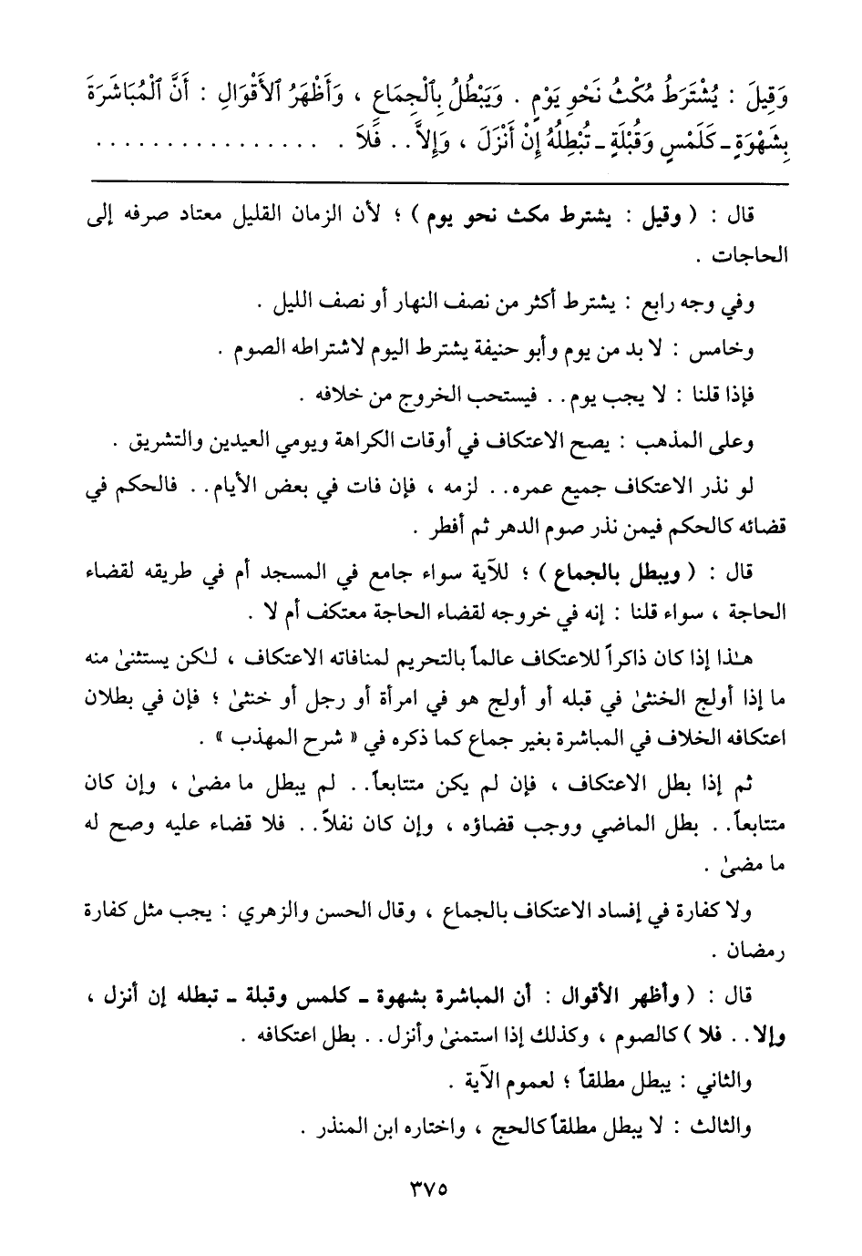 وَقِيلَ: يُشْتَرَطُ مُكْثُ نَحْوِ يَوْمٍ. وَيَبْطُلُ بِالْجِمَاعِ، وَأَظْهَرُ الأَقْوَالِ: أَنَّ الْمُبَاشَرَةَ بِشَهْوَةٍ - كَلَمْسٍ وَقُبْلَةٍ - تُبْطِلُهُ إِنْ أَنْزَلَ، وَإِلاَّ .. فَّلاَ