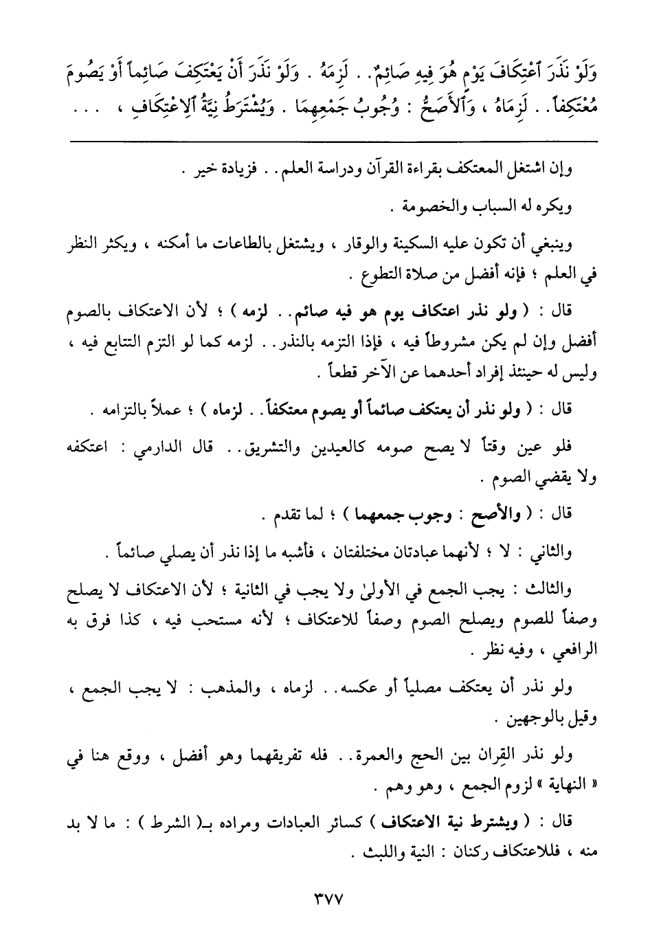وَلَوْ نَذَرَ اعْتِكَافَ يَوْمٍ هُوَ فِيهِ صَائِمٌ .. لَزِمَهُ. وَلَوْ نَذَرَ أَنْ يَعْتَكِفَ صَائِمًا أَوْ يَصُومَ مُعْتَكِفًا .. لَزِمَاهُ، وَالأَصَحُّ: وُجُوبُ جَمْعِهِمَا. وَيُشْتَرَطُ نِيَّةُ الاِعْتِكَافِ،
