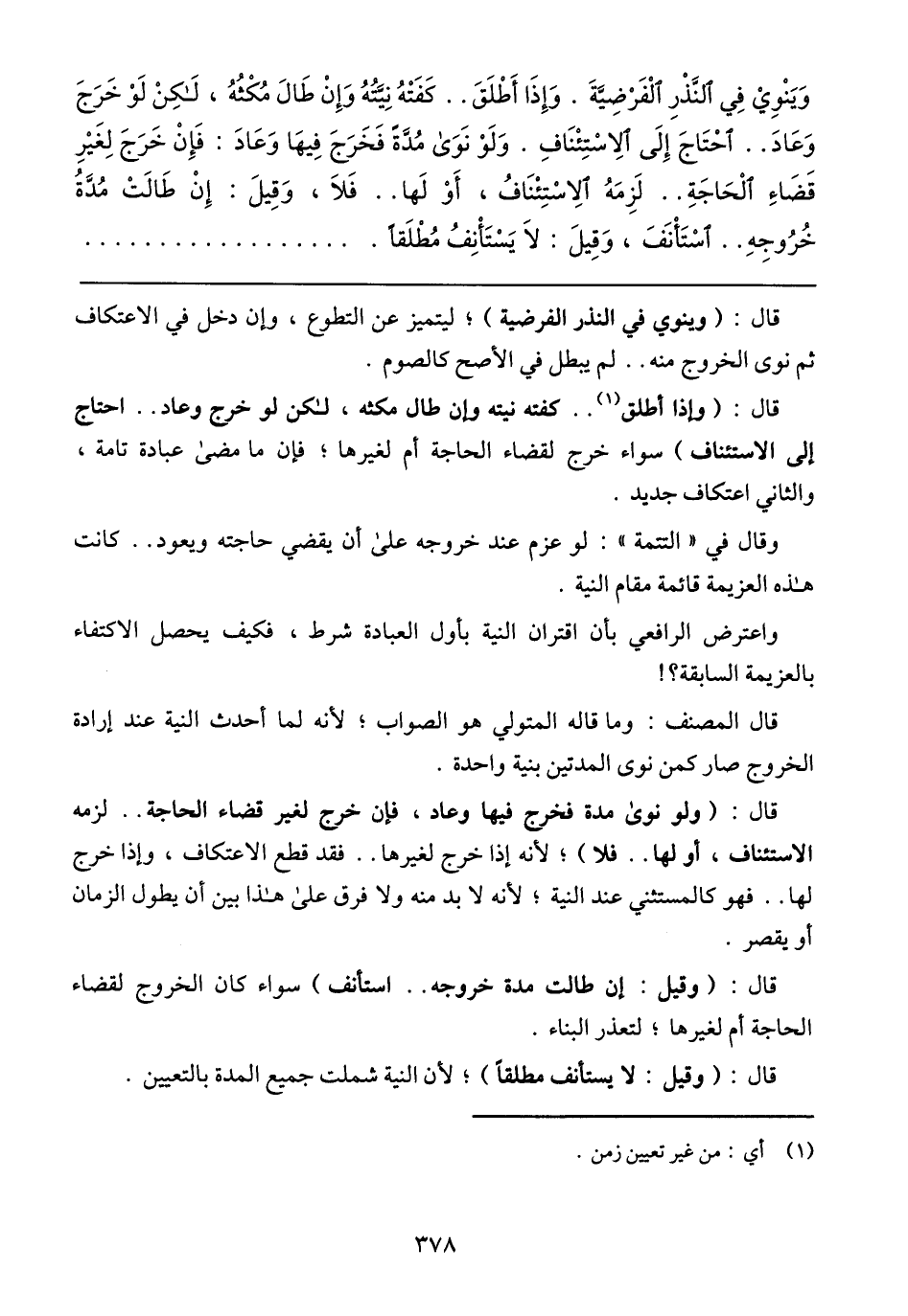 وَيَنْوِيْ فِي النَّذْرِ الْفَرْضِيَّةَ. وَإِذَا أَطْلَقَ .. كَفَتْهُ نِيَّتُهُ وَإِنْ طَالَ مُكْثُهُ، لَكِنْ لَوْ خَرَجَ وَعَادَ .. احْتَاجَ إِلَى الاِسْتِئْنَافِ. وَلَوْ نَوَىَ مُدَّةً فَخَرَجَ فِيهَا وَعَادَ: فَإِنْ خَرَجَ لِغَيْرِ قَضَاءِ الْحَاجَةِ .. لَزِمِهُ الاِسْتِئْنَافُ، أَوْ لَها .. فَلَا، وَقِيلَ: إِنْ طَالَتْ مُدَّةُ خُرُوجِهِ .. اسْتَانَفَ، وَقِيلَ: لَا يَسْتَانِفُ مُطْلَقًا