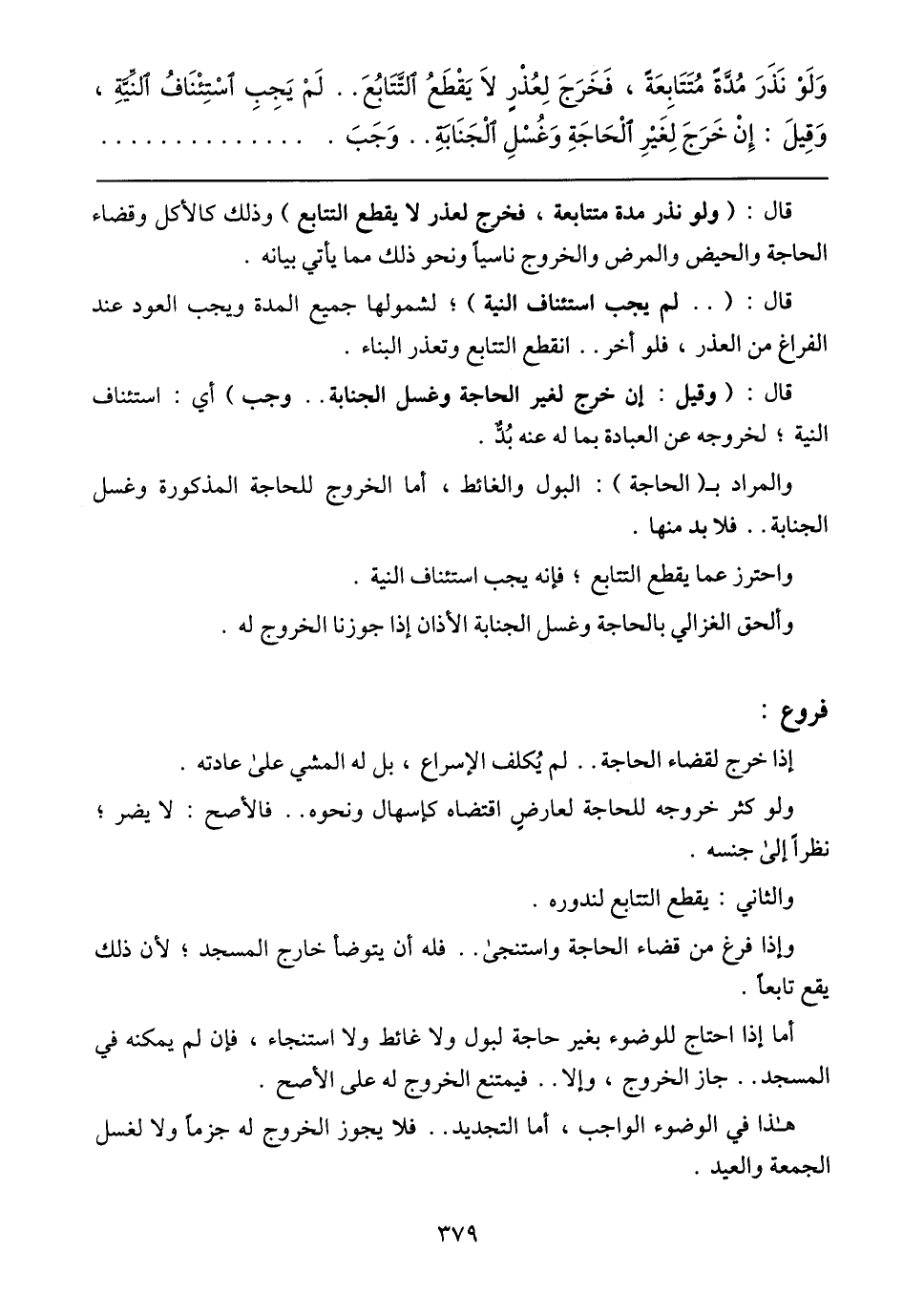 والمراد بـ (الحاجة): البول والغائط، أما الخروج للحاجة المذكورة وغسل الجنابة .. فلا بد منها.