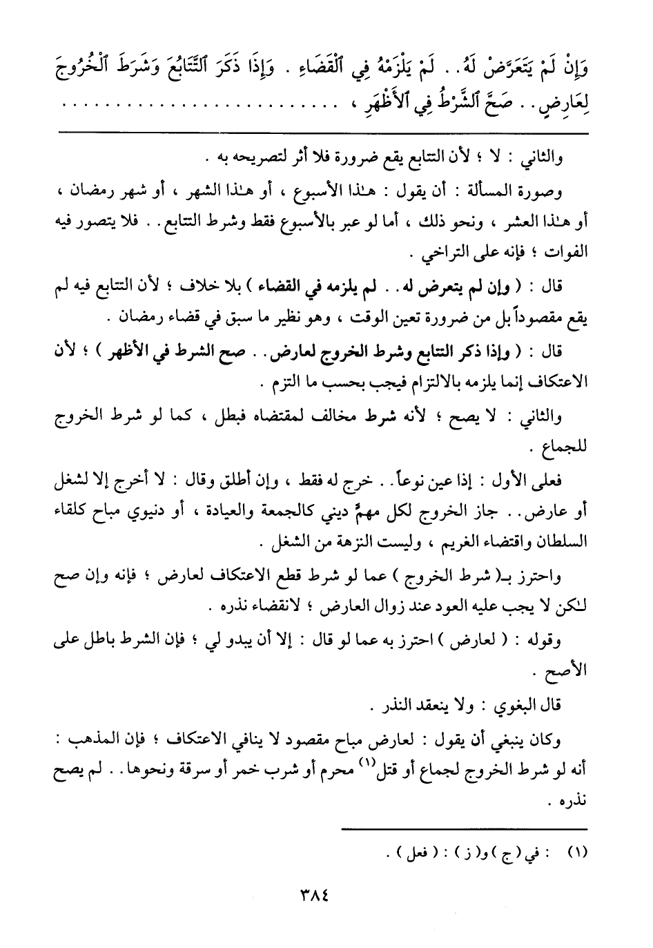 وَإِنْ لَمْ يَتَعَرَّضْ لَهُ .. لَمْ يَلْزَمْهُ فِي الْقَضَاءِ. وَإِذَا ذَكَرَ التَّتَابُعَ وَشَرَطَ الْخُرُوجَ لِعَارِضٍ .. صَحَّ الشَّرْطُ فِي الأَظْهَرِ،