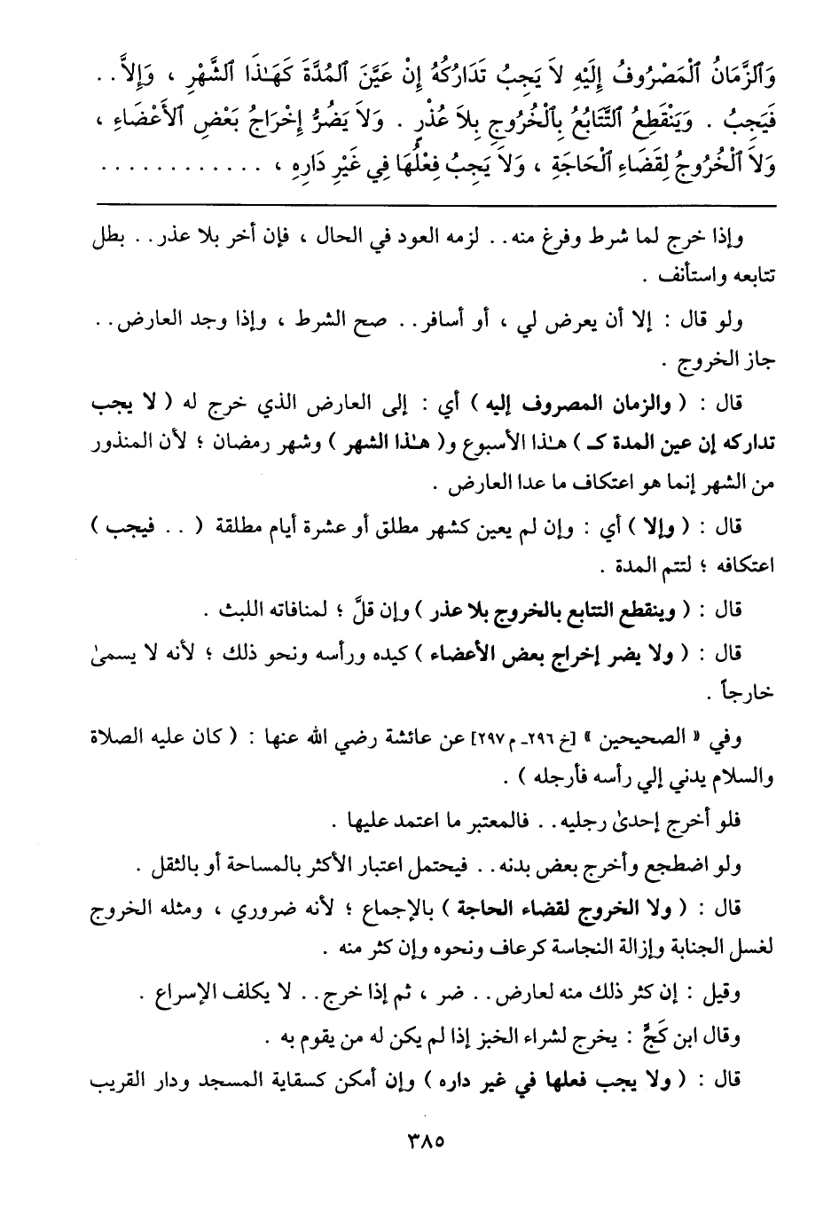 وَالزَّمَانُ الْمَصْرُوفُ إِلَيْهِ لَا يَجِبُ تَدَارُكُهُ إِنْ عَيَّنَ المُدَّةَ كَهَذَا الشَّهْرِ، وَإِلَّا .. فَيَجِبُ. وَيَنْقَطِعُ التَّتَابُعُ بِالْخُرُوجِ بِلَا عُذْرٍ. وَلَا يَضُرُّ إِخْراجُ بَعْضِ الأَعْضَاءِ، وَلَا الْخُرُوجُ لِقَضَاءِ الْحَاجَةِ، وَلَا يَجِبُ فِعْلُهَا فِي غَيْرِ دَارِهِ،