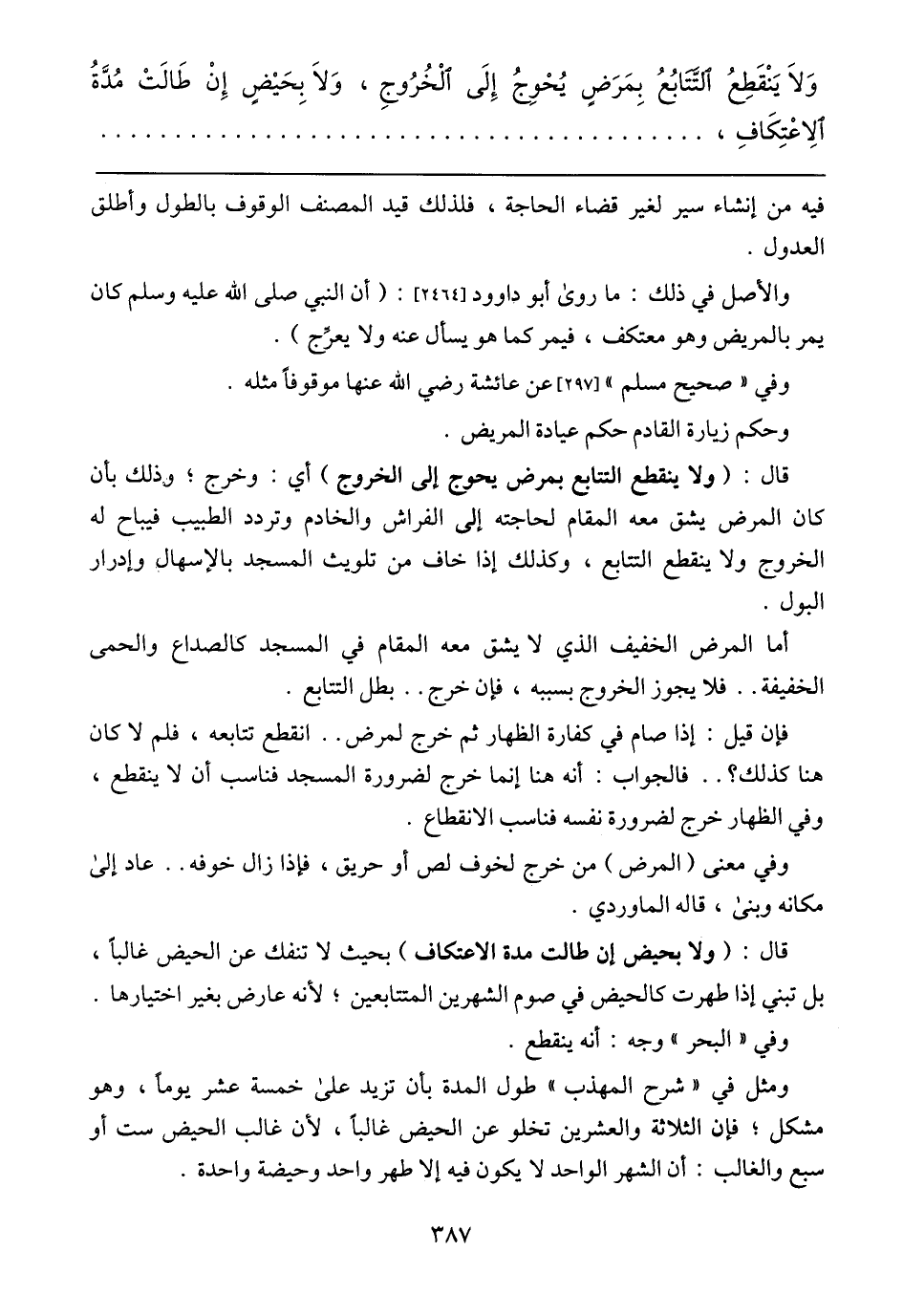 قال: (ولا بحيض إن طالت مدة الاعتكاف) بحيث لا تنفك عن الحيض غالبًا، بل تبني إذا طهرت كالحيض في صوم الشهرين المتتابعين؛ لأنه عارض بغير اختيارها.
