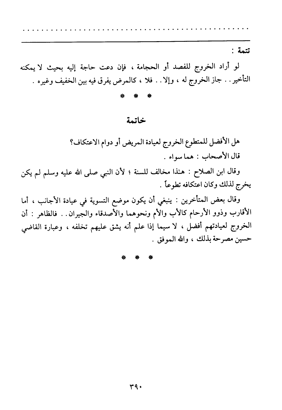 وقال بعض المتأخرين: ينبغي أن يكون موضع التسوية في عيادة الأجانب، أما الأقارب وذوو الأرحام كالأب والأم ونحوهما والأصدقاء والجيران .. فالظاهر: أن الخروج لعيادتهم أفضل، لا سيما إذا علم أنه يشق عليهم تخلفه، وعبارة القاضي حسين مصرحة بذلك، والله الموفق.