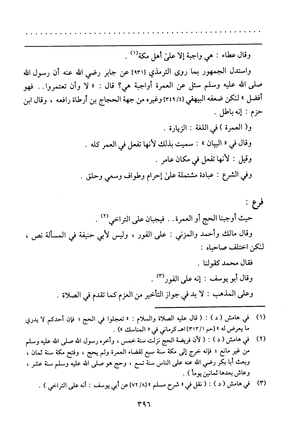 واستدل الجمهور بما روى الترمذي [931] عن جابر رضي الله عنه أن رسول الله صلى الله عليه وسلم سئل عن العمرة أواجبة هي؟ قال: (لا وأن تعتمروا .. فهو أفضل)) لكن ضعفه البيهقي [4/ 349] وغيره من جهة الحجاج بن أرطاة رافعه، وقال ابن حزم: إنه باطل.