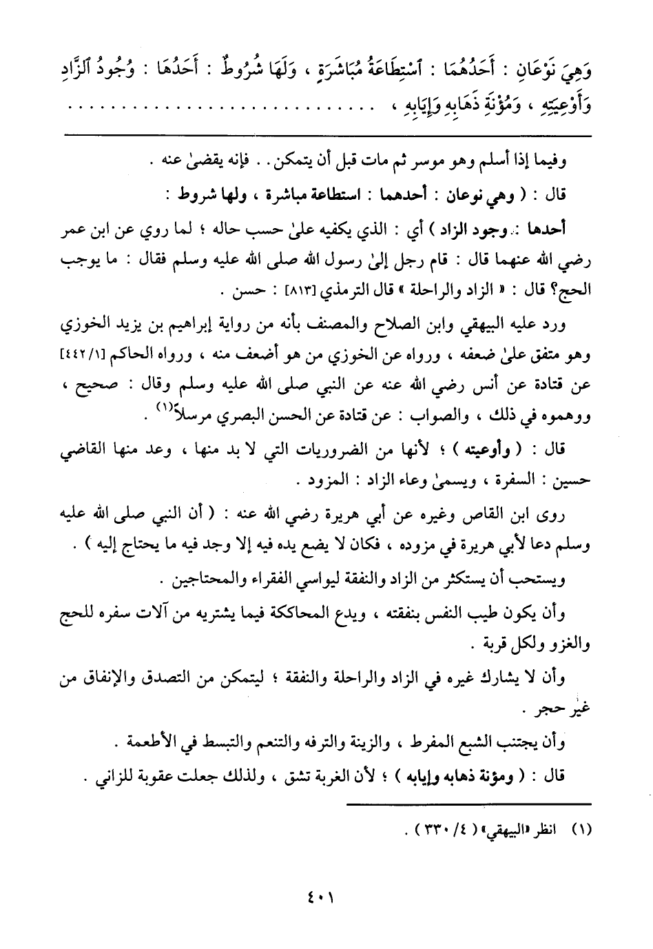 وهِيَ نَوْعَانِ: أَحَدُهُمَا اسْتِطَاعَةُ مُبَاشَرَةٍ , وَلَهَا شُرُوطٌ: أَحَدُهَا (وُجُودُ الزَّادِ وَأَوْعِيَتُهُ، مُؤَنِهِ ذَهَابِهِ وَإِيَابِهِ