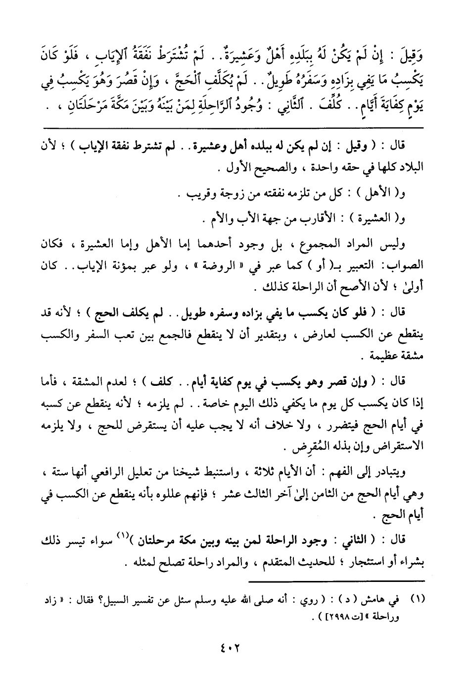 وَقِيلَ إنْ لَمْ يَكُنْ لَهُ بِبَلَدِهِ أَهْلٌ وَعَشِيرَةٌ لَمْ تُشْتَرَطْ نَفَقَةُ الْإِيَابِ , فَلَوْ كَانَ يَكْتَسِبُ مَا يَفِي بِزَادِهِ وَسَفَرُهُ طَوِيلٌ لَمْ يُكَلَّفْ الْحَجَّ وَإِنْ قَصُرَ وَهُوَ يَكْتَسِبُ يوم كفاية أيام .. كلف. الثَّانِي وُجُودُ الرَّاحِلَةِ لِمَنْ بَيْنَهُ وَبَيْنَ مَكَّةَ مَرْحَلَتَانِ