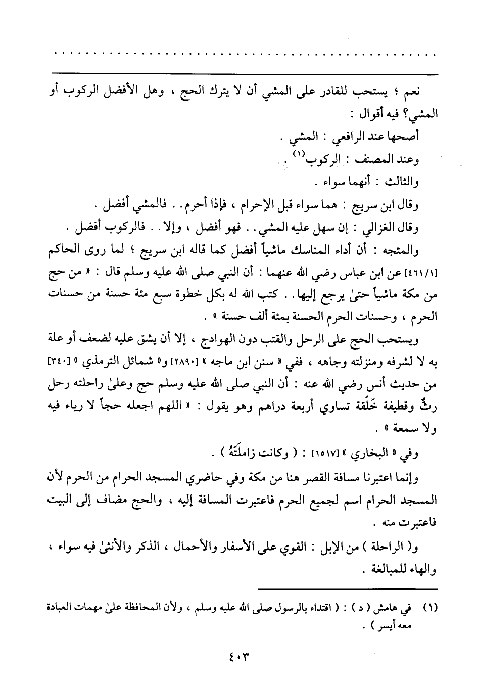 والمتجه: أن أداء المناسك ماشيًا أفضل كما قاله ابن سريج، لما روي الحاكم (1/ 461) عن ابن عباس رضي الله عنهما: أن النبي صلى الله عليه وسلم قال: (من حج من مكانه ماشيًا حتي يرجع إليها. كتب الله له بكل خطوة سبع مئة حسنة من حسنات الحرم، وحسنات الحرم الحسنة بمئة ألف حسنة)