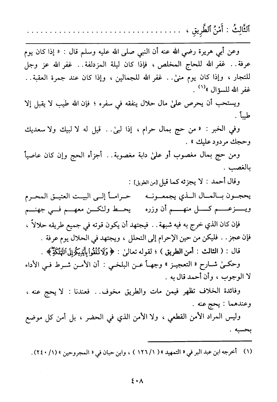 قال: (الثالث: أمن الطريق)، لقوله تعالي: {ولا تلقوا بأيديكم إلي التهلكة}.