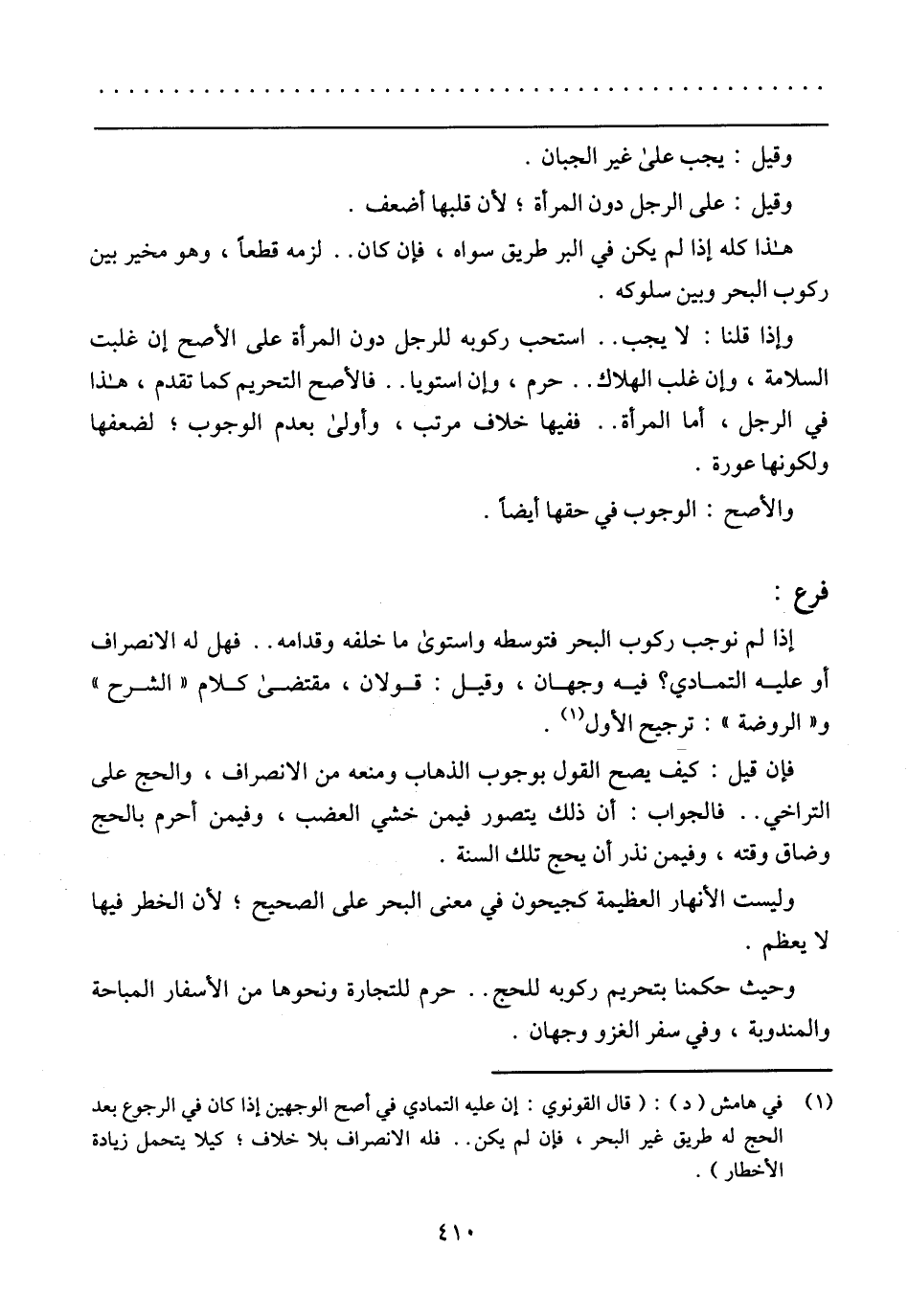 وإذا قلنا: لا يجب ... استحب ركوبه للرجل دون المرأة علي الأصح إن غلبت السلامة، وإن غلب الهلاك ... حرم، وإن استويا ... فالأصح التحريم كما تقدم، هذا في الرجل، أما المرأة ... ففيها خلاف مرتب، وأولي بعدم الوجوب، لضعفها ولكونها عورة.