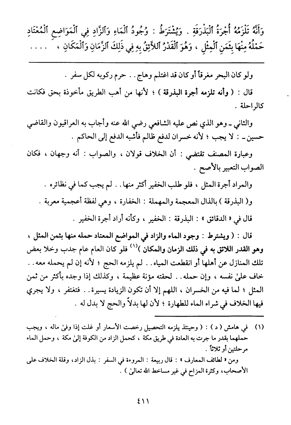 وَأَنَّهُ يَلْزَمُهُ أُجْرَةُ الْبَذْرَقَةِ، وَيُشْتَرَطُ وُجُودُ الْمَاءِ وَالزَّادِ فِي الْمَوَاضِعِ الْمُعْتَادِ حَمْلُهُ مِنْهَا بِثَمَنِ الْمِثْلِ