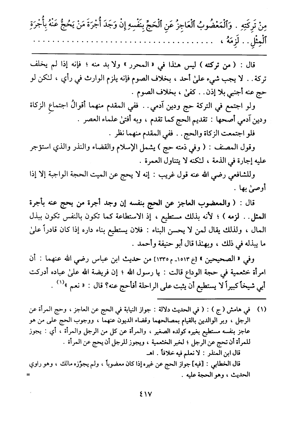 وقول المصنف: (وفي ذمته) يشمل الإسلام والقضاء والنذر والذي استؤجر عليه إجارة في الذمة، لكنه لا يتناول العمرة.