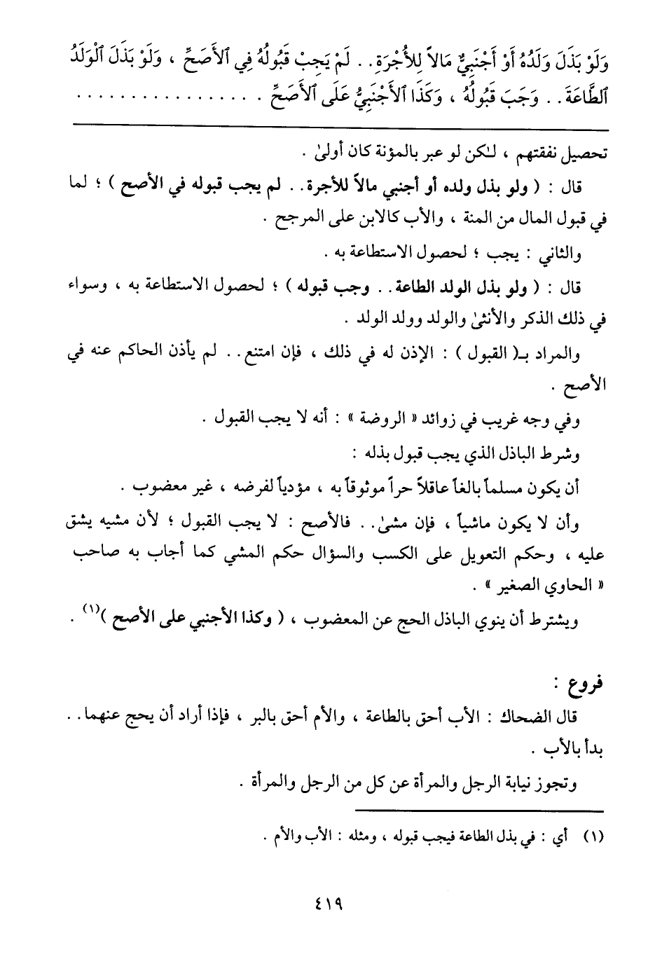 قال: (ولو بذل الولد الطاعة .. ,جب قبوله)، لحصوله الاستطاعة به، وسواء في ذلك الذكر والأنثى والولد وولد الولد.