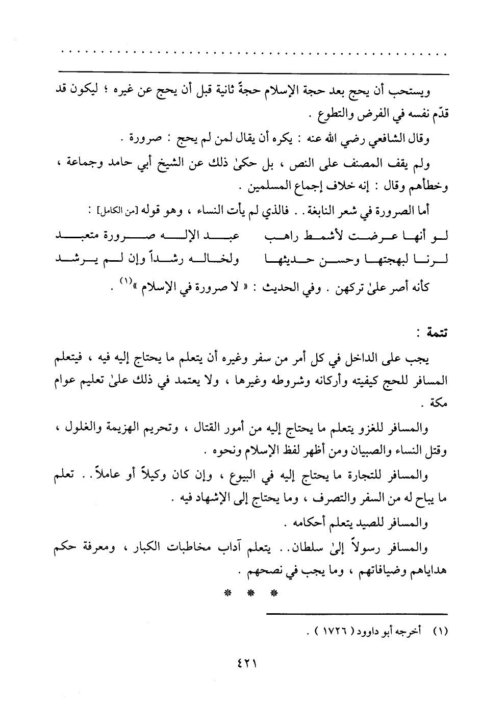 والمسافر للتجارة ما يحتاج إليه في البيوع، وإن كان وكيلًا أو عاملًا .. تعلم ما يباح له من السفر والتصرف، وما يحتاج إلى الإشهاد فيه.