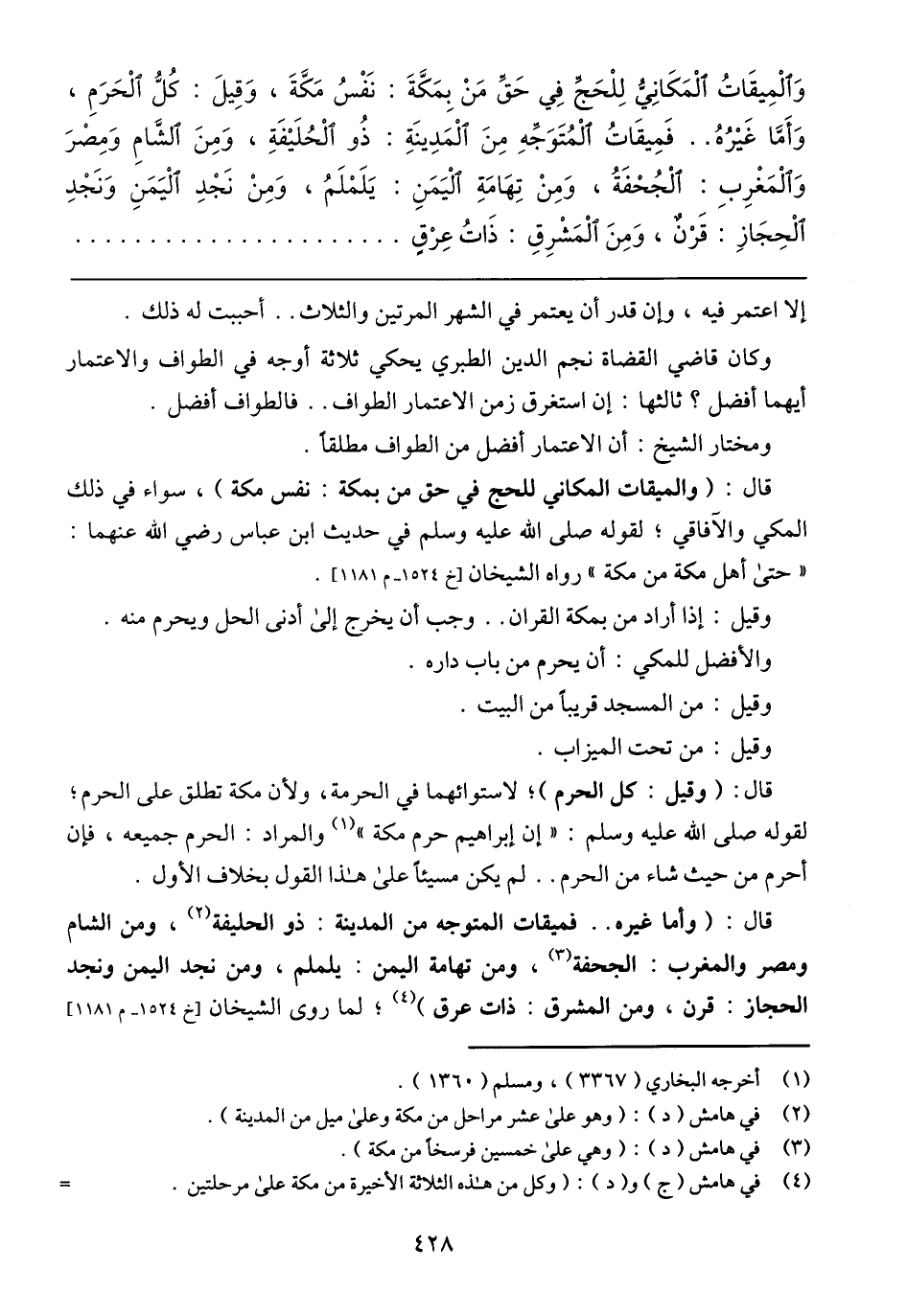 وَالْمِيقَاتُ الْمَكَانِيُّ لِلْحَجِّ فِي حَقِّ مَنْ بِمَكَّةَ: نَفْسُ مَكَّةَ، وَقِيلَ: كُلُّ الحَرَمِ، وَأَمَّا غَيْرُهُ فَمِيقَاتُ الْمُتَوَجِّهِ مِنْ الْمَدِينَةِ ذُو الْحُلَيْفَةِ، وَمِنْ الشَّامِ وَمِصْرَ وَالْمَغْرِبِ: الْجُحْفَةُ، وَمِنْ تِهَامَةِ الْيَمَنِ: يَلَمْلَمُ، وَمِنْ نَجْدِ الْيَمَنِ وَنَجْدِ الْحِجَازِ قَرْنٌ، ومِنَ الْمَشْرِقِ ذَاتَ عِرْقٍ