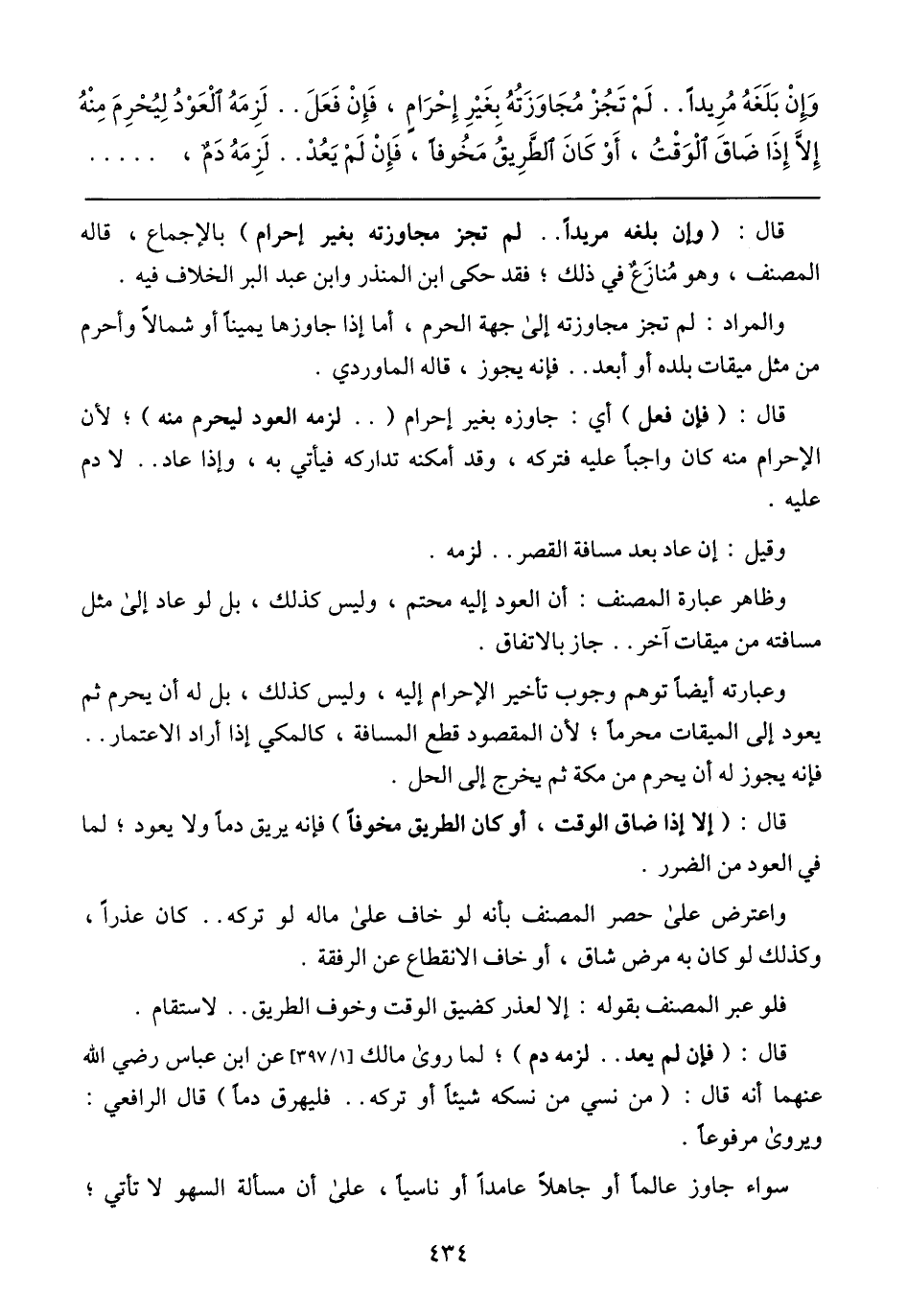إِنْ بَلَغَهُ مُرِيدًا لَمْ تَجُزْ مُجَاوَزَتُهُ بِغَيْرِ إحْرَامٍ , فَإِنْ فَعَلَ لَزِمَهُ الْعَوْدُ لِيُحْرِمَ مِنْهُ إلَّا إذَا ضَاقَ الْوَقْتُ , أَوْ كَانَ الطَّرِيقُ مَخُوفًا , فَإِنْ لَمْ يَعُدْ لَزِمَهُ دَمٌ،
