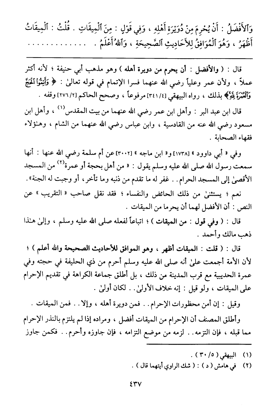 قال: (والأفضل: أن يحرم من دويرة أهله) وهو مذهب أبي حنيفة؛ لأنه أكثر عملًا، ولأن عمر وعليًا رضي الله عنهما فسرا الإتمام في قوله تعالى: {وَأَتِمُّوا الْحَجَّ وَالْعُمْرَةَ لِلَّهِ} بذلك، رواه البيهقي [4/ 341] مرفوعًا، وصحح الحاكم [2/ 276] وقفه.