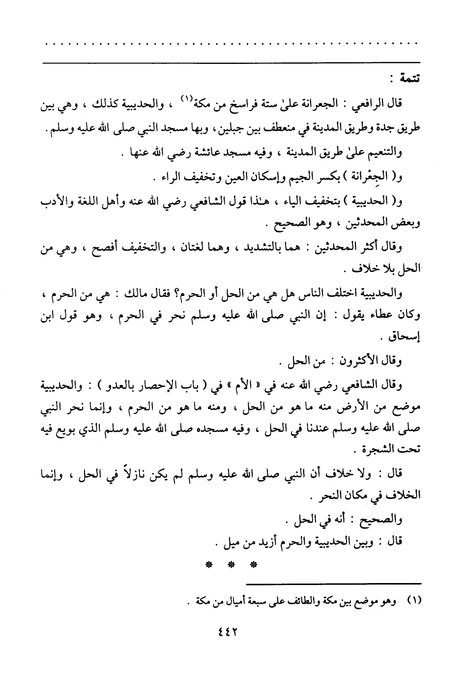 قال الرافعي: الجعرانة على ستة فراسخ من مكة، والحديبية كذلك، وهي بين طريق جدة وطريق المدينة في منعطف بين جبلين، وبها مسجد النبي صلى الله عليه وسلم.